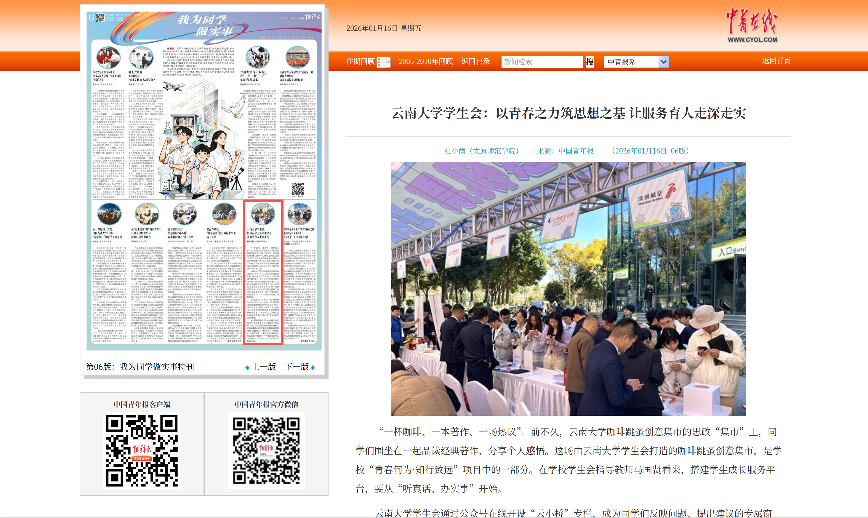 1月16日,中国青年报第六版推出“我为同学做实事特刊”,云南大学学生会“以青春之力筑思想之基 让服务育人走深走实”经验做...