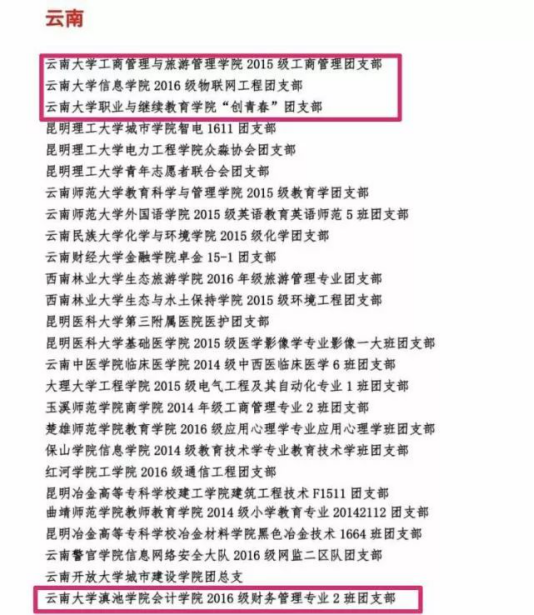 3月1日,团中央公布了全国高校“活力团支部”创建遴选结果,我校工商管理与旅游管理学院2015级工商管理团支部、信息学院2016级物联网工程团支部、职业与继续教育学院“创青春”团支部、云南大学滇池学院会计学院财务管理专业2016级2班团支部共4个支部荣获全国高校“活力团支部”称号。2016年我校共3个团支部获全国高校“活力团支部”称号,我校团支部连续两年获全国高校“活力团支部”荣誉称号数量居全省第一,全国前列。
