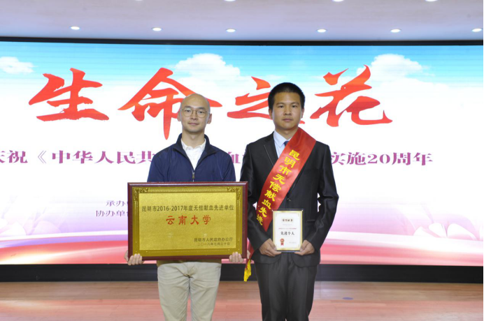 9月28日,“生命之花”——庆祝《献血法》实施20周年暨无偿献血先进单位和先进个人表扬仪式在昆明举行。本活动由昆明市献血领导小组主办,旨在对昆明2016至2017年度无偿献血工作中做出突出贡献的先进单位、优秀组织,以及先进个人进行表扬,激励全社会健康适龄公民积极参与无偿献血社会公益活动。云南大学获评无偿献血先进单位,云南大学张世成同学获无偿献血先进个人。校团委代表学校领奖。