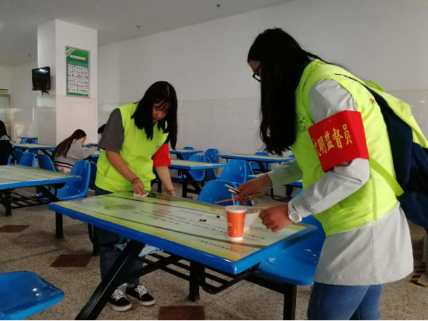 在食堂门口,行色匆匆或有说有笑的同学们被鲜艳醒目的海报吸引,纷纷驻足观看展板所展示的各种不文明行为。“绿马甲”“红袖章”的身影出没在校园的各个角落:
