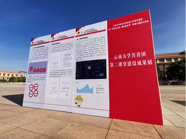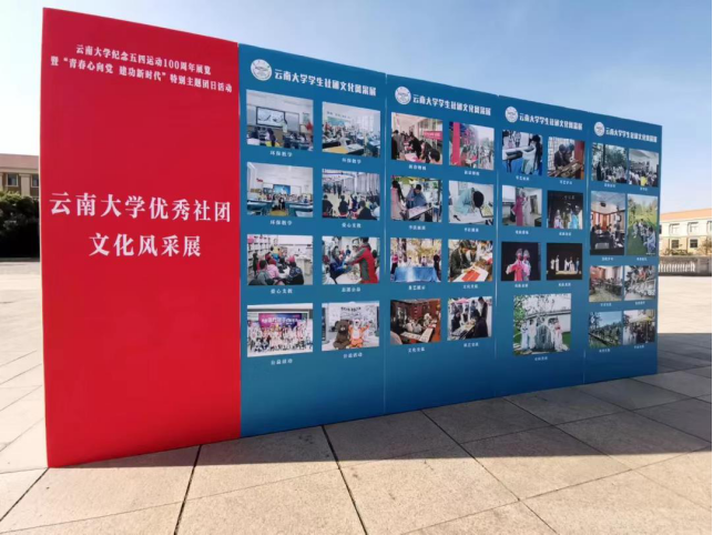 云南大学优秀社团风采展分6个板块展示了志愿公益、学术科技、文化活动、体育活动等类别学生社团的活动情况。