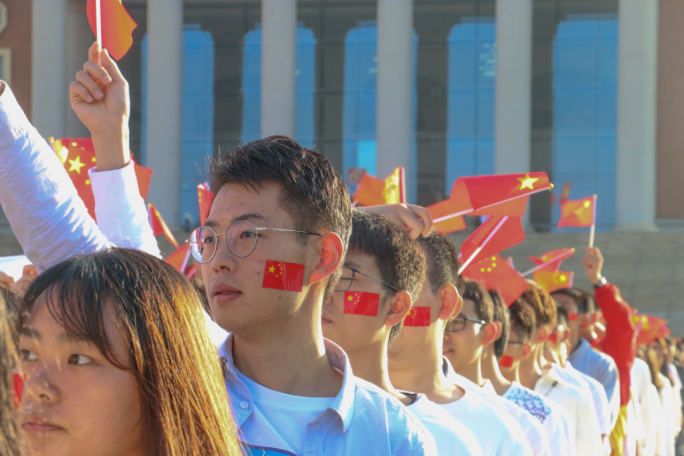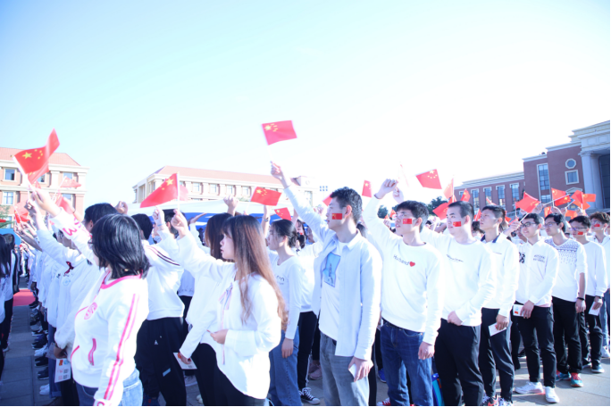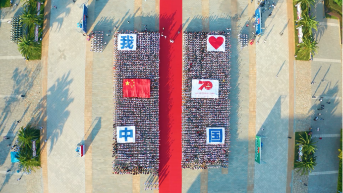 升旗仪式的最后,全场师生仰望航拍器,挥动手中的国旗、手卡和纪念明信片,大声喊出“我爱你!中国!我爱你!中国!”一同为祖国点赞,向祖国告白。