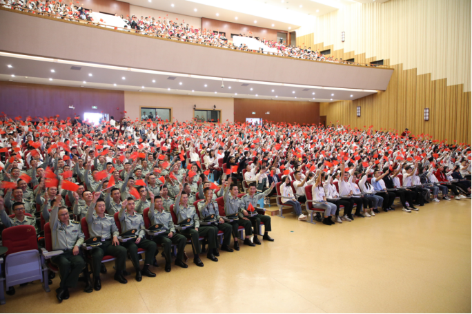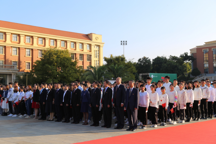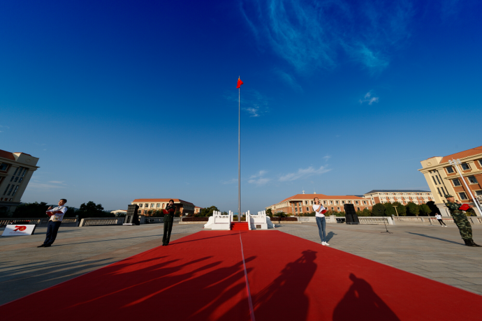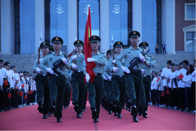 “迎国旗——”,嘹亮的声音贯穿整个文典广场,升旗仪式在国防生国旗护卫队庄严隆重的出旗仪式中开始,伴随着雄壮的国歌声,国旗护卫队迈着坚定有力的步伐走向升旗台,一声号令,升旗手迎风振臂,五星红旗迎着朝阳冉冉升起。全场师生庄严肃立,齐唱国歌,用满腔的激情表达对祖国的赤诚热爱和衷心祝福。