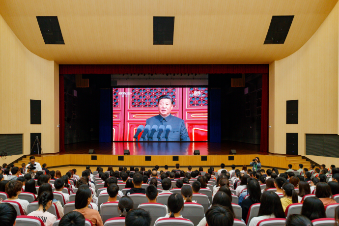 在主题活动第二阶段,校党委书记林文勋,校长方精云和全体校领导,相关职能部门负责人以及1200余名师生集体观看了庆祝中华人民共和国成立70周年大会和阅兵式直播,认真学习习近平总书记在庆祝中华人民共和国成立70周年大会上的重要讲话精神,一同感受直播盛况为大家带来的振奋与自豪。