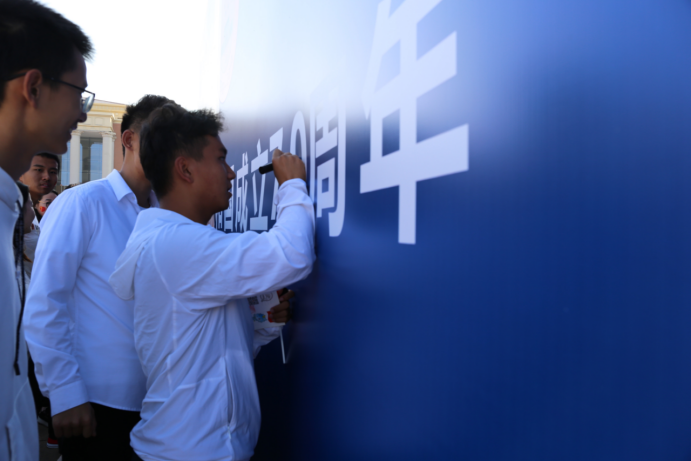 升旗仪式结束后,现场师生在“庆祝中华人民共和国成立70周年”“我与祖国共奋进” “青春告白祖国”主题签字墙上签字留言,写下了铮铮青春誓言。很多师生驻足拍照,与国旗同框,与国旗合影,用自己特有的方式庆祝祖国70华诞。