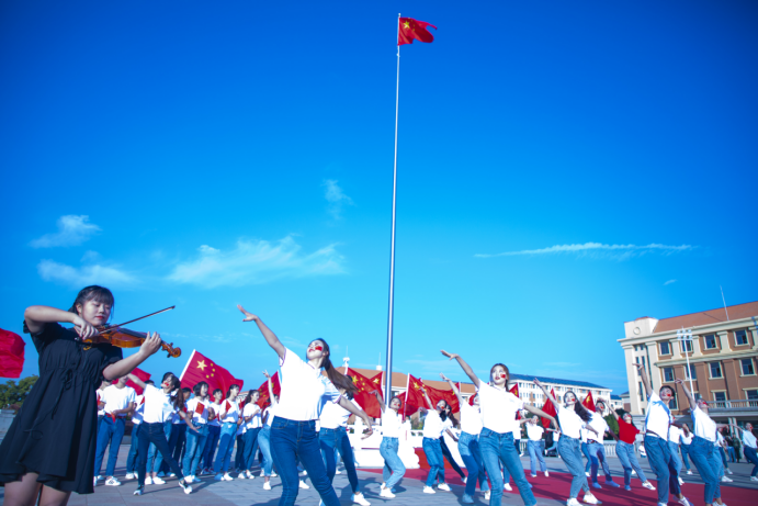 升旗仪式上,学生艺术团的同学们用快闪的形式献礼国庆,伴着《我和我的祖国》的旋律,同学们轻舞飞扬、动情弹奏、深情歌唱,快闪表演引起全场师生的共鸣,参加活动的师生们一起歌颂祖国,用双手撑起“我爱中国”的字样共同祝福祖国华诞。