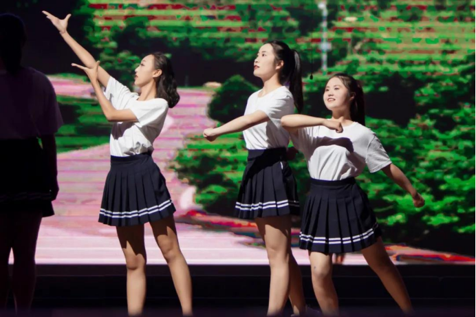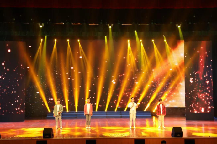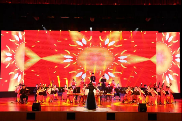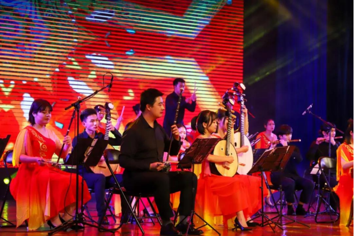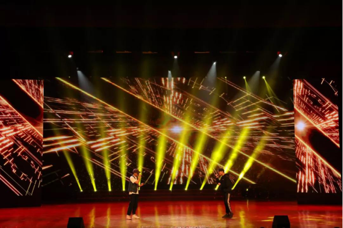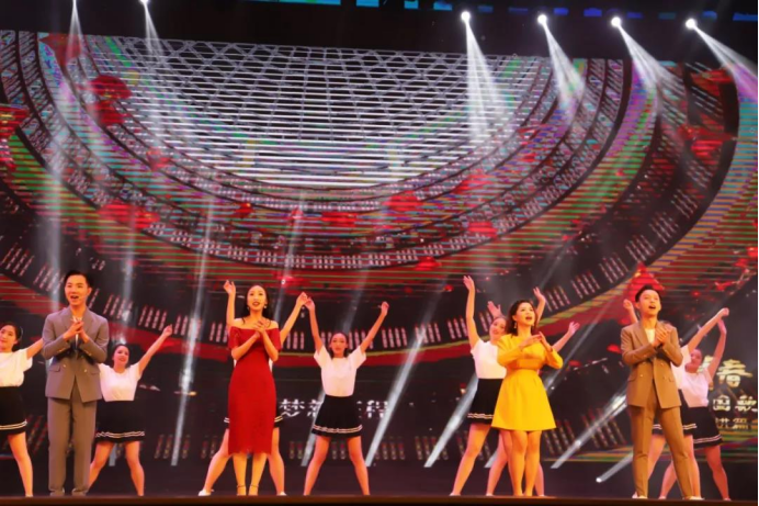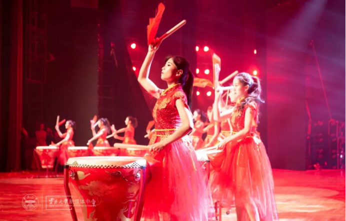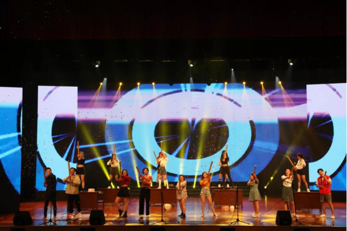 晚会在旋律激昂、热情洋溢的器乐表演《金蛇狂舞》中拉开帷幕。万花红筒的背景渲染着喜悦欢腾的现场气氛,弦歌不辍,新时代的青年用铿锵的节奏点燃这场青春盛会的开演。