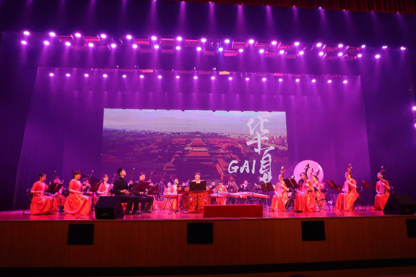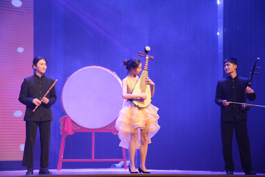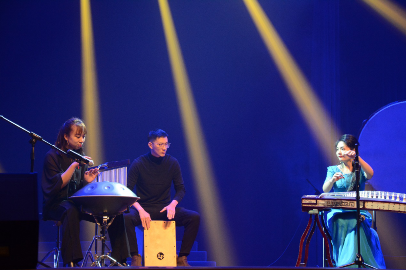 师生们还先后演奏了《大田后生仔》《China-P》两首风格迥异的作品,将热歌、国风音乐进行创意改编,让观众听到了不一样的流行音乐。在这寒冷的冬夜传来空灵而神秘的声音,师生同台演绎,玩转韵律,把年轻新潮的手碟箱鼓与古筝相结合,带来全新曲目《凌冬》。