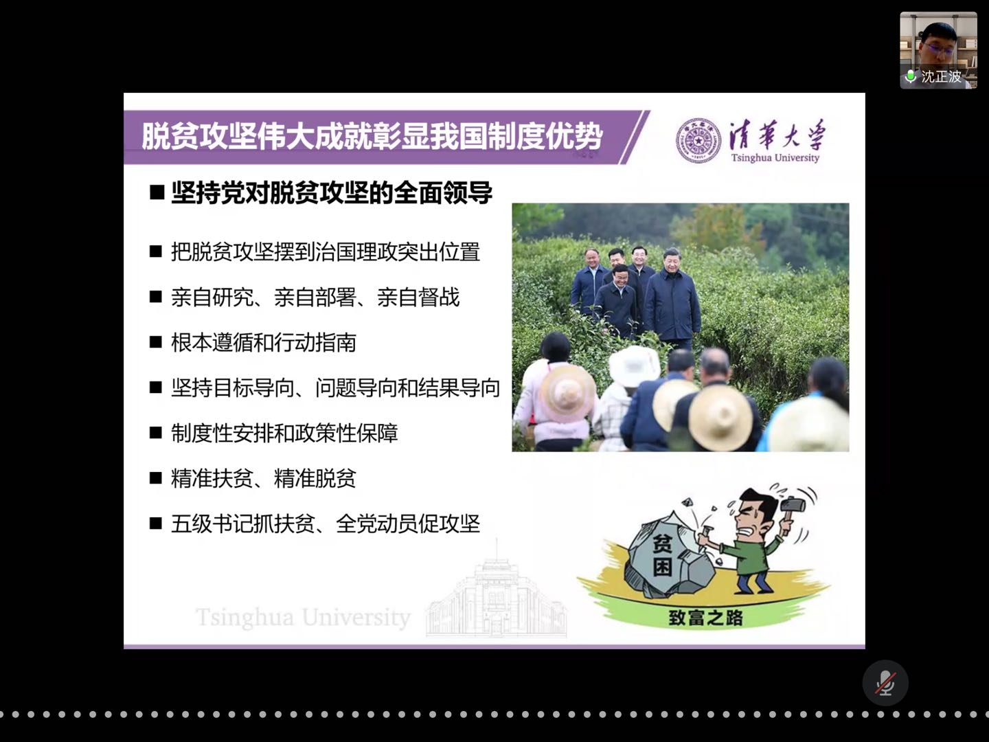 清华大学党委研工部教师沈正波作题为“百名驻村第一书记讲脱贫——用奋斗和担当打通脱贫攻坚最后一公里”的报告,分享其担任南涧彝族自治县南涧镇西山村党总支第一书记、驻村扶贫工作队长期间开展脱贫攻坚工作的经历和感受,介绍了我国脱贫攻坚的政策和取得的显著成就,用他的行动和事迹告诉了大家什么叫“奋斗”,什么叫“担当”。