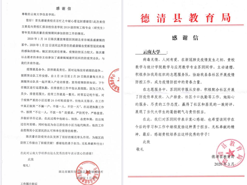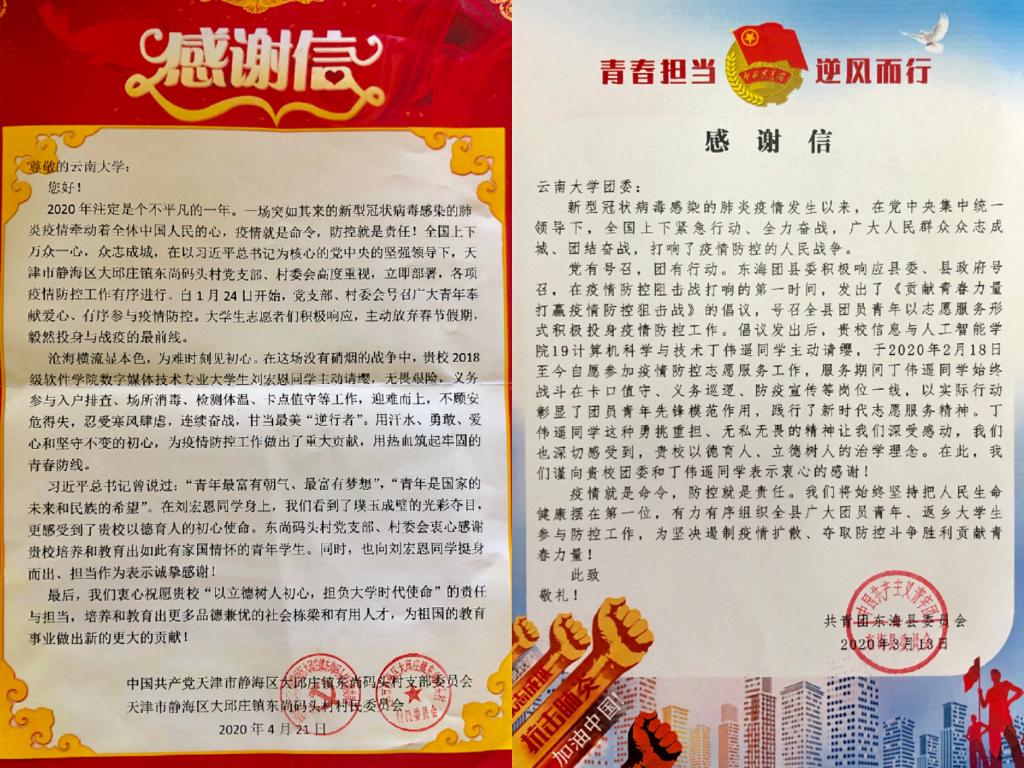 同学们的行动受到了社会的高度肯定,近日,当地社区(村)、有关团组织和其他单位部门向学校和团委纷纷发来表扬信,来信对学校以德育人、立德树人的实在成效给予高度评价。信中指出,云大青年学子在疫情面前无畏艰险,迎难而上,用汗水、勇敢、爱心和坚守不变的初心,积极配合当地开展防疫工作。云大青年学子贴心的服务和尽责的工作态度,践行了新时代志愿服务精神,赢得了社区、村民的一致好评,为疫情防控工作做出了应有贡献,为青年一代树立了榜样和标杆。