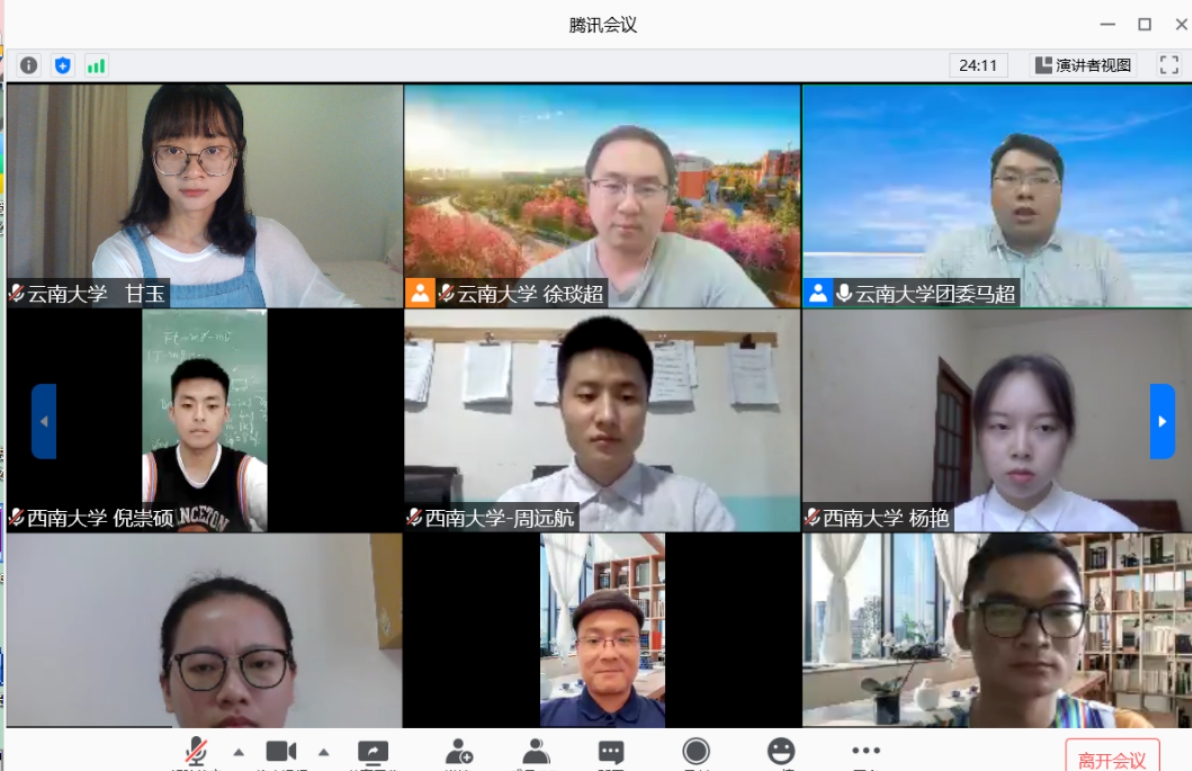 在座谈会上。三所高校12名研究生支教团代表分享了习近平总书记2020年以来关于青年工作重要论述的学习心得和“我的扶贫故事”。哈工大研支团张宇飞和李晶同学围绕“肯定、期望、关心”三个词,从习近平总书记给哈工大百年校庆的贺信出发,表示将努力成为总书记口中的可堪大用、能担重任的西部建设者。西南大学研支团倪崇硕和杨璐齐同学学习了习近平总书记对新时代青年的寄语,深刻体会到青年人应该勇担重任,努力成为脱贫攻坚洪流中奔涌前行的“后浪”,用实际行动诠释奉献的青春。我校研支团刘航麟和谢佳颖同学通过学习习近平总书记关于青年工作的重要论述,并结合自身支教经历表示“祖国需要处,皆是我故乡”,接下来他们将重回校园,努力学习,练就过硬本领,勇担时代使命,以实际行动和优异成绩回报总书记的深切关怀和殷切期望。哈工大研支团桑子为和李婧雯同学向大家介绍了“索玛芬芳,爱满凉山”项目,该项目不仅给受助学生助学金还给予他们开眼看世界的机会,并分享了哈工大研支团云南队一直传承与不断创新的“天地有爱”专项基金、“爱心卫生计划”、“点亮计划”等项目。西南大学研支团安明瑞和司金冉同学分享了在支教地开展的以“一五课堂”为代表的各项活动,他们表示将怀着向上的力量,踏踏实实走好支教的每一步、克服困难,做好支教扶贫工作。我校研支团贡山县独龙江乡分队谢梓菲和李思媛同学分享了他们在中缅边境、滇藏交界的独龙江乡多措并举开展教育扶贫的故事以及支教扶贫生活带给他们的感想感悟,并表示云大每一届研支团都将不惧艰险,扎根边疆,用青春热血奉献教育扶贫,充分展示云大青年在脱贫攻坚一线助力边疆少数民族“一步跨千年”的生动实践,践行云大青年求真力行,砥砺前行的坚毅品格。