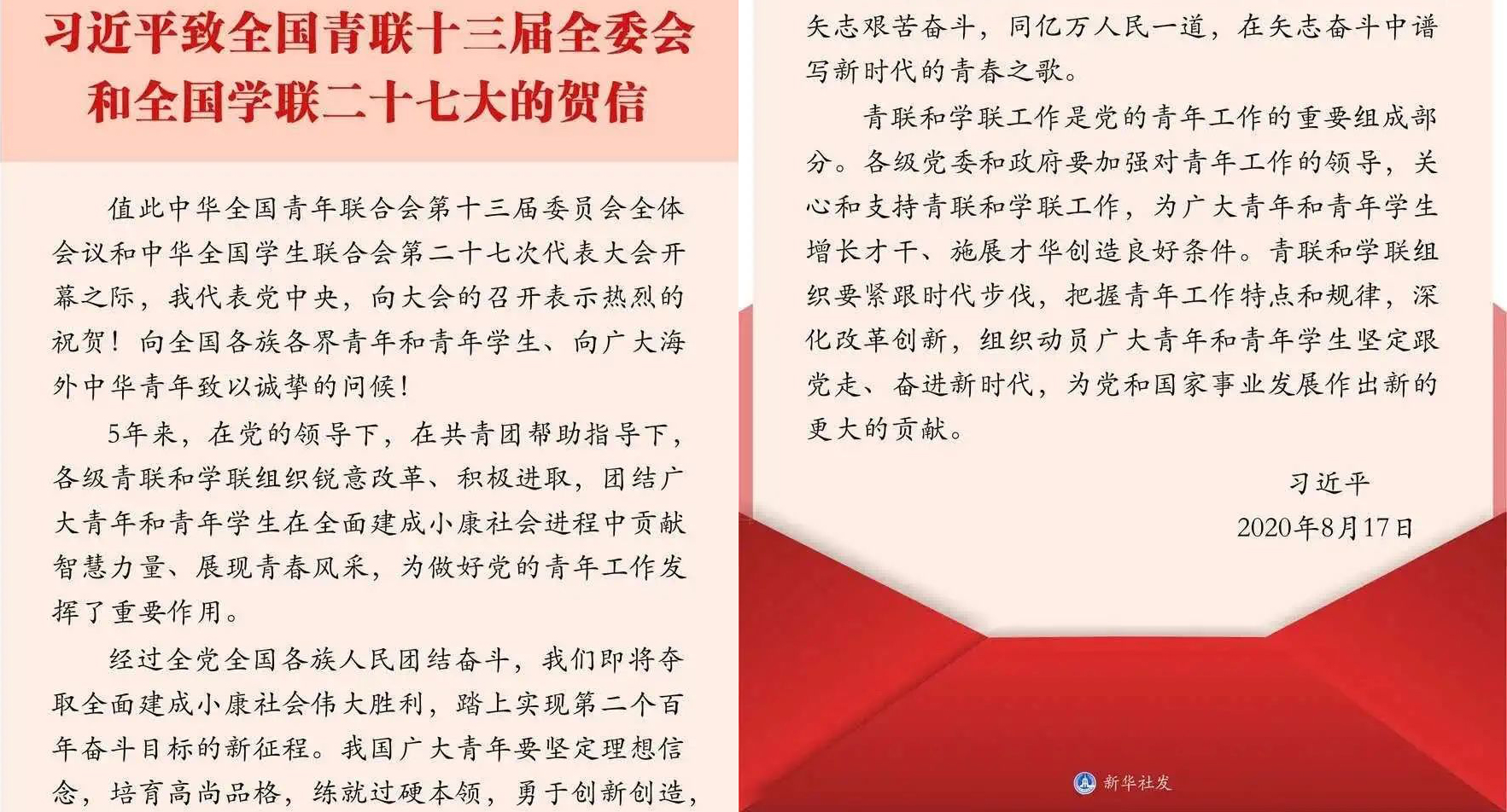 中华全国青年联合会第十三届委员会全体会议、中华全国学生联合会第二十七次代表大会于2020年8月17日至18日顺利召开。习近平总书记专门发来贺信,代表党中央向大会的召开表示祝贺,并向全国各族各界青年、青年学生和海外中华青年致以诚挚的问候。