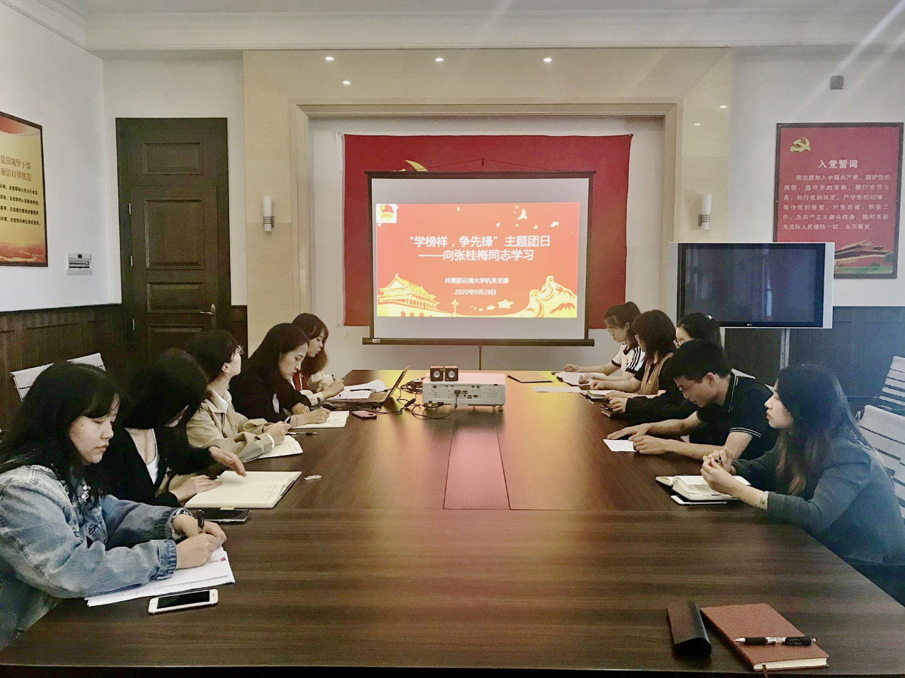 2020年9月29日,云南大学共青团机关支部在机关党员活动室开展“学榜样、争先锋”主题团日活动,集体学习张桂梅同志先进事迹。机关党委副书记李玉兰出席活动,机关团支部书记代悦棋主持活动。