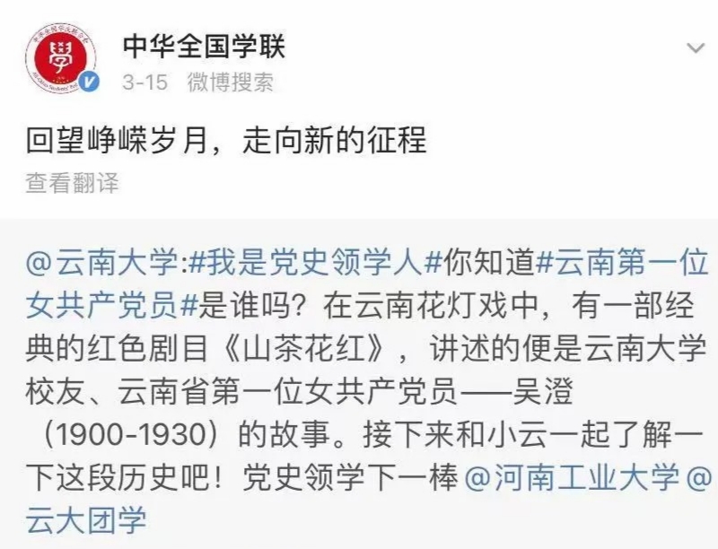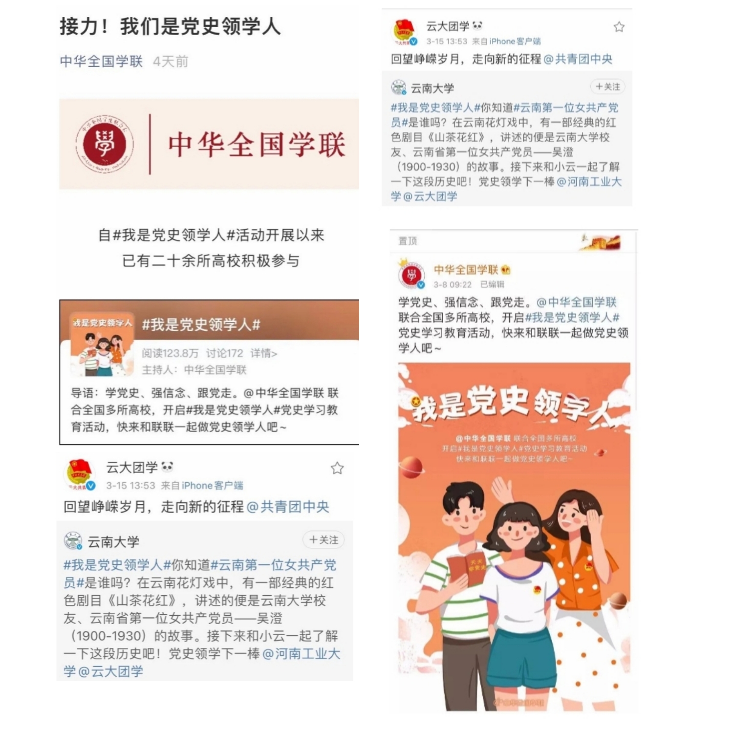 云南大学团委积极参与本次微博接力活动,在前期认真准备的基础上,联动云南大学官方微博@云南大学、云南大学团委官方微博@云大团学共同接力,有效参与了#我是党史领学人#微博接力活动,营造了良好的党史学习教育氛围。