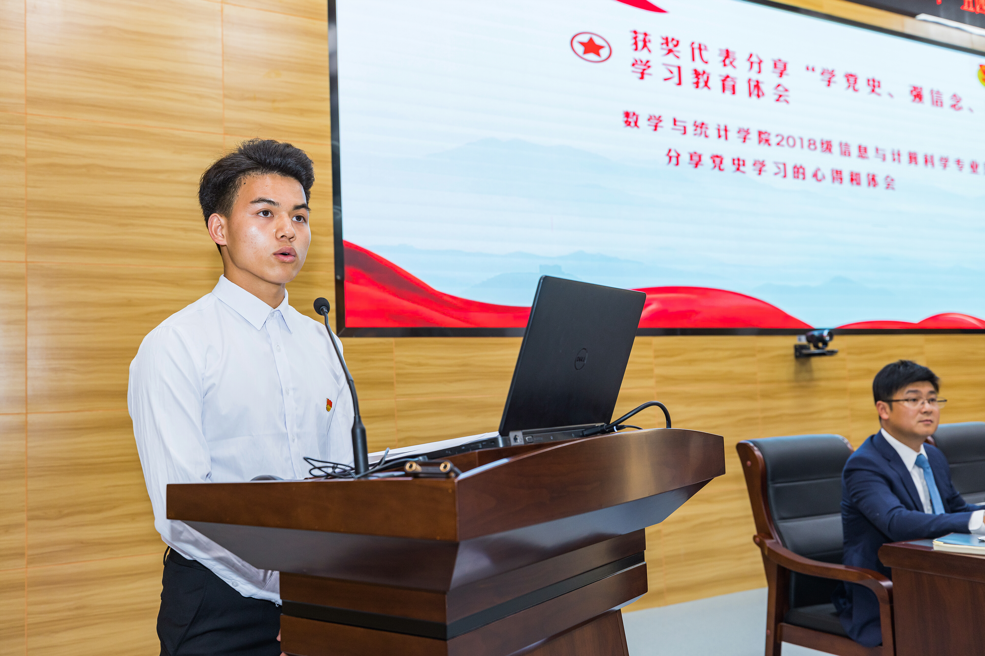“优秀共青团员”获奖代表数学与统计学院2018级信息与计算科学专业彭涛同学分享了自己如何从校、院、班三级层面学好党史这门“必修课”,并呼吁广大团员青年们肩负起历史使命,坚定前进信心,立大志、明大德、成大才、担大任。