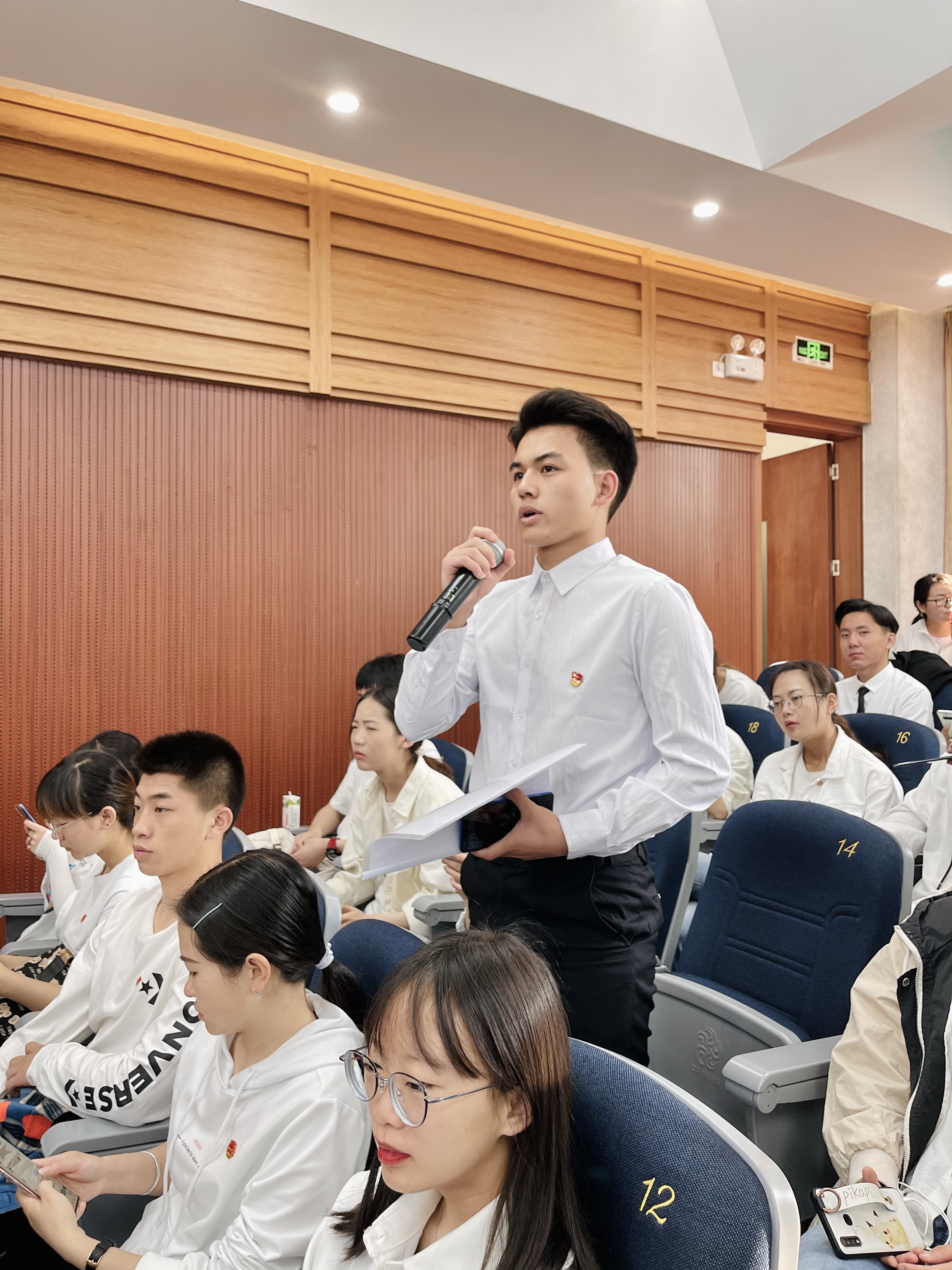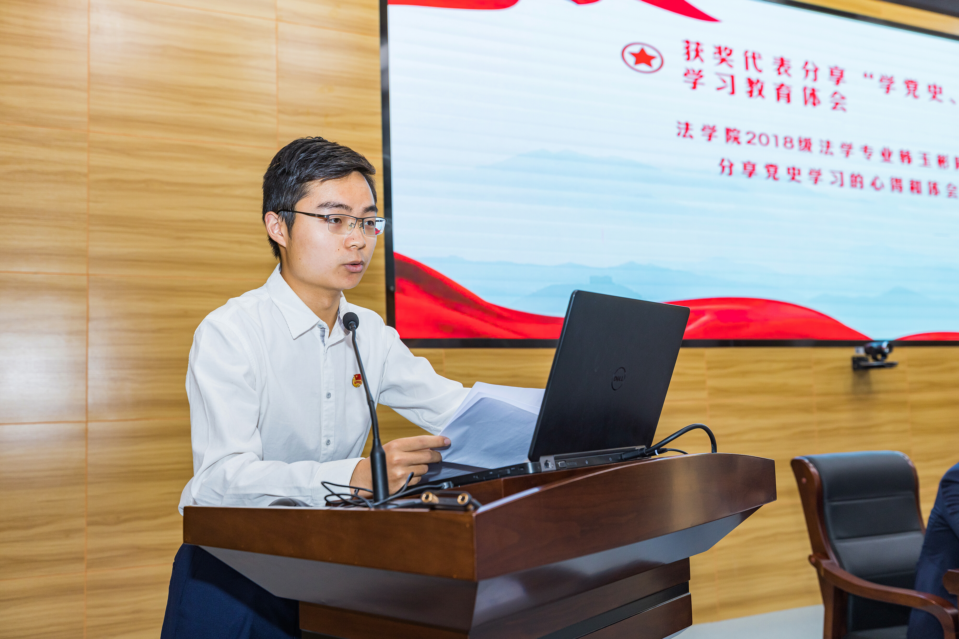 “优秀共青团干部”获奖代表法学院2018级法学专业韩玉彬同学以“读懂历史发展大势,担当青年时代责任”为主题,以坚决树立并保持正确党史观为主线,结合团支部工作实际分享了学党史的所思所想。