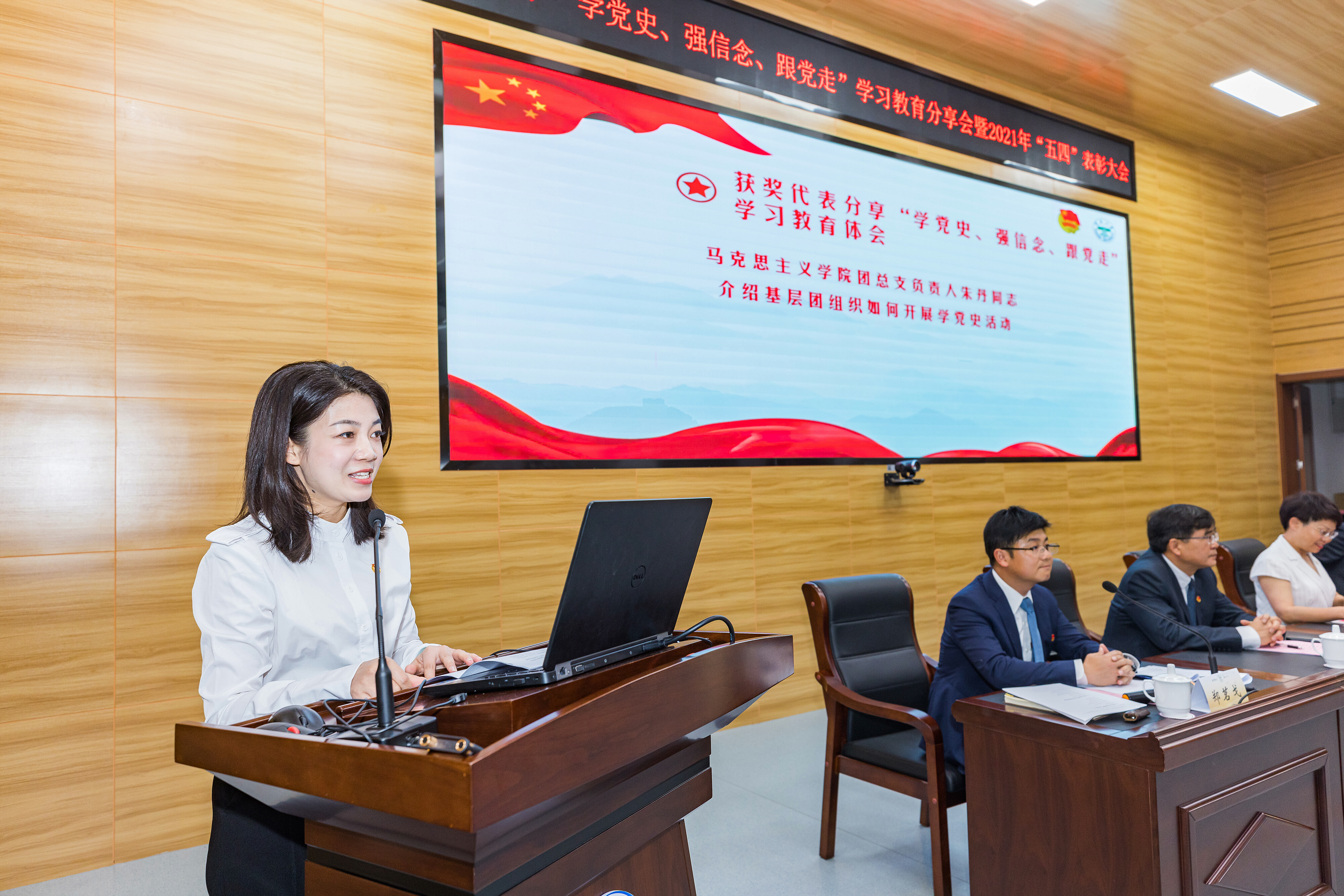 红旗团总支获奖代表马克思主义学院团总支负责人朱丹同志就基层团组织如何开展党史学习教育在会上作分享,明确基层团组织开展党史学习教育的站位、思路、路径应围绕坚持“立德树人”根本任务,聚焦党史学习教育重要任务,统筹两个课堂,深入强化队伍建设、平台建设、组织建设,以可视化成果转化的方式做好党史学习教育工作。