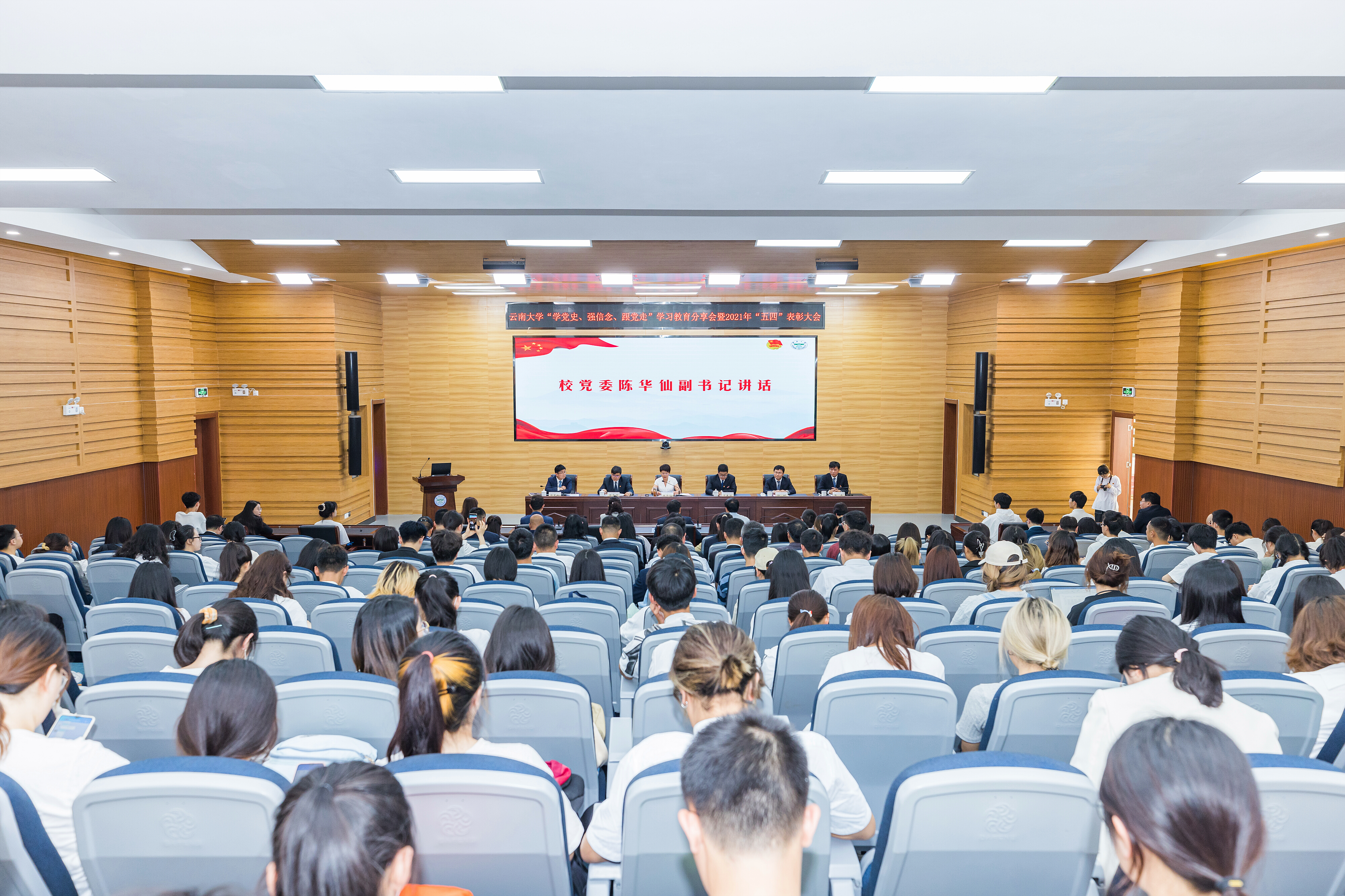 4月30日上午,为深入学习贯彻习近平总书记考察清华大学时的重要讲话精神,分享“学党史、强信念、跟党走”学习教育经验,总结表彰学校共青团系统先进集体和优秀个人,云南大学召开“学党史、强信念、跟党走”学习教育分享会暨2021年“五四”表彰大会。云南大学党委陈华仙副书记、党政办公室于春滨主任、党委组织部陈克清部长、党委宣传部柳树部长、学生工作部张岳部长出席会议。各院级党组织副书记、各院级团组织负责人、校团委全体工作人员、2021年“五四”表彰先进集体和个人,以及团员青年代表300余人参加会议。校团委郑茗戈书记主持会议。