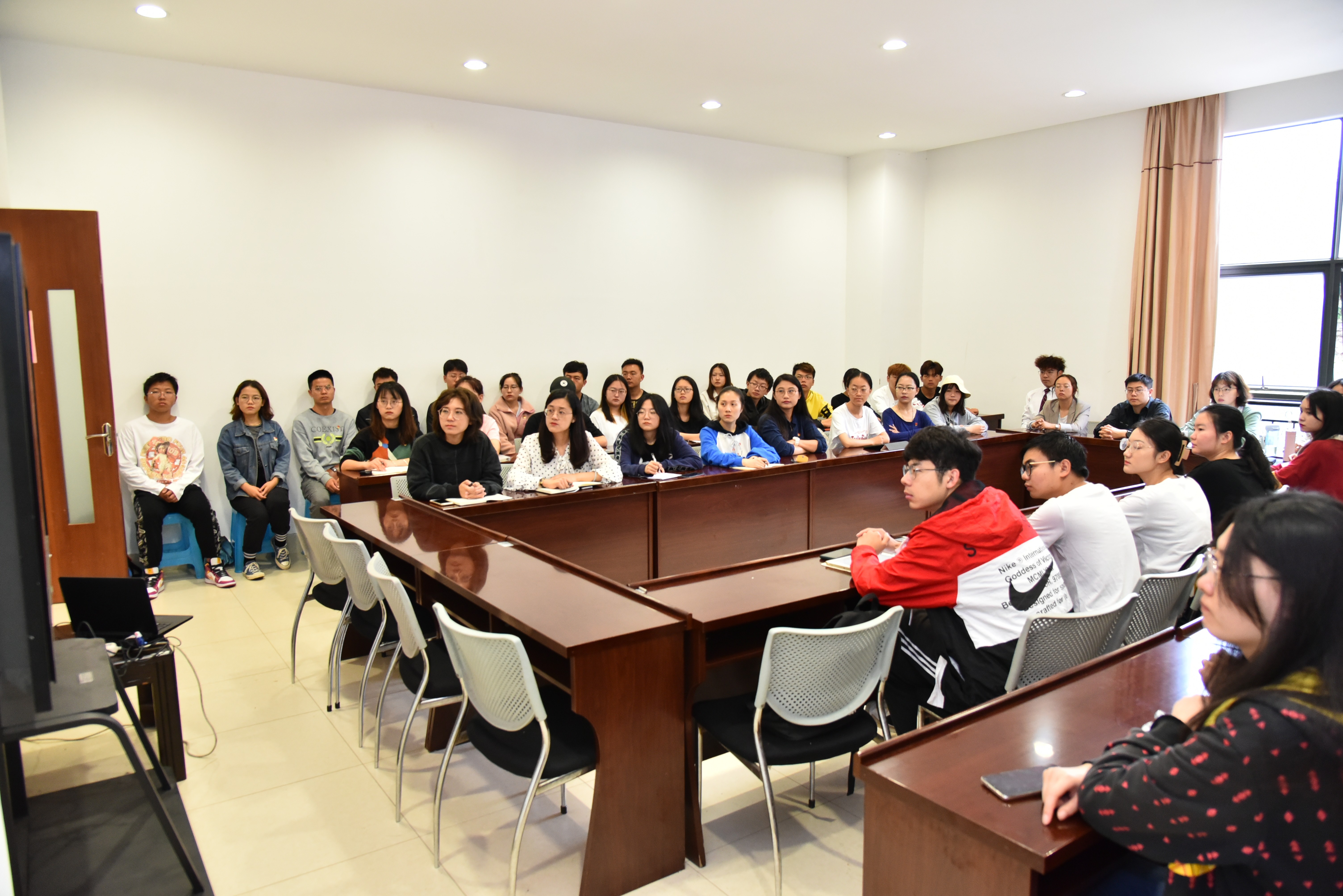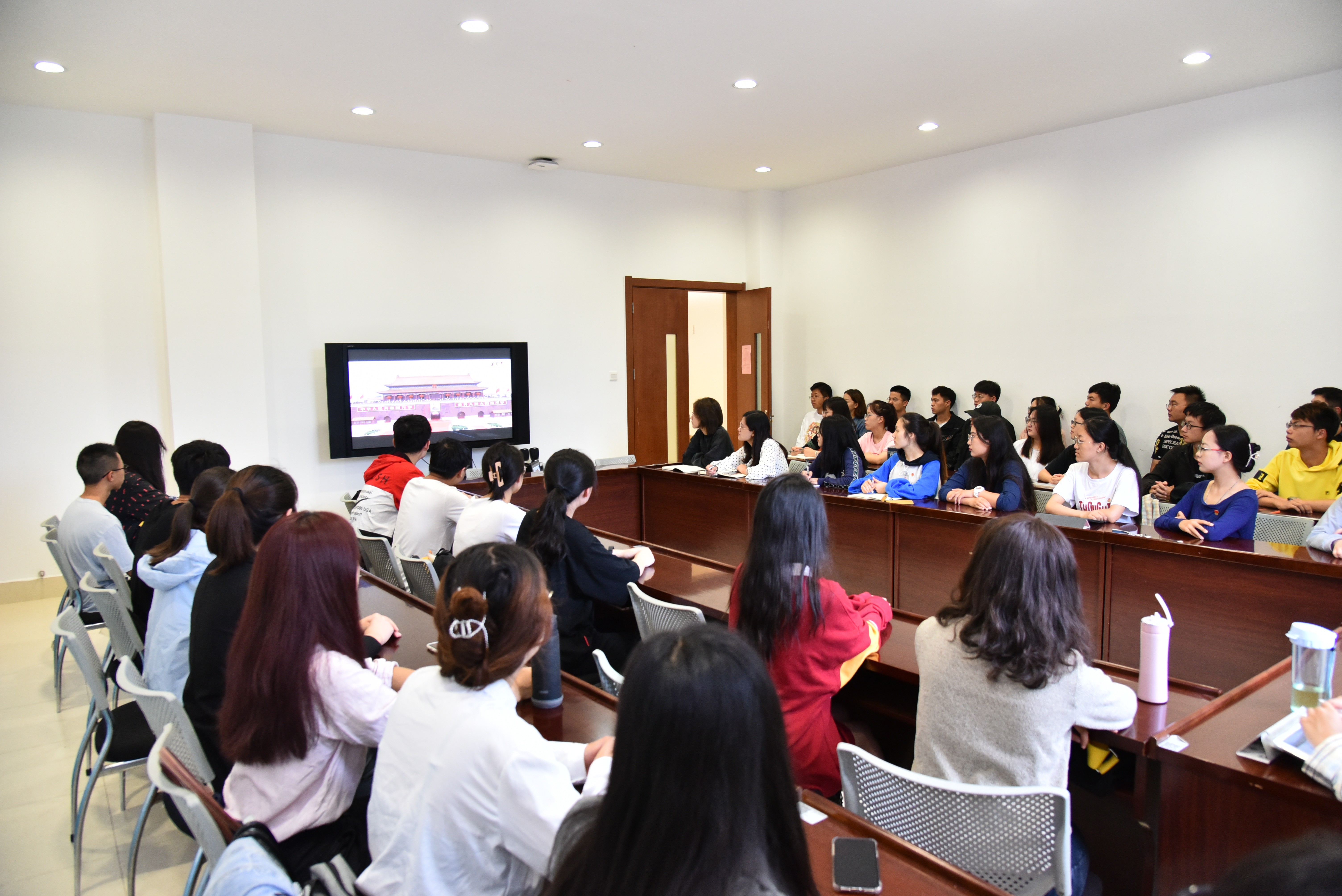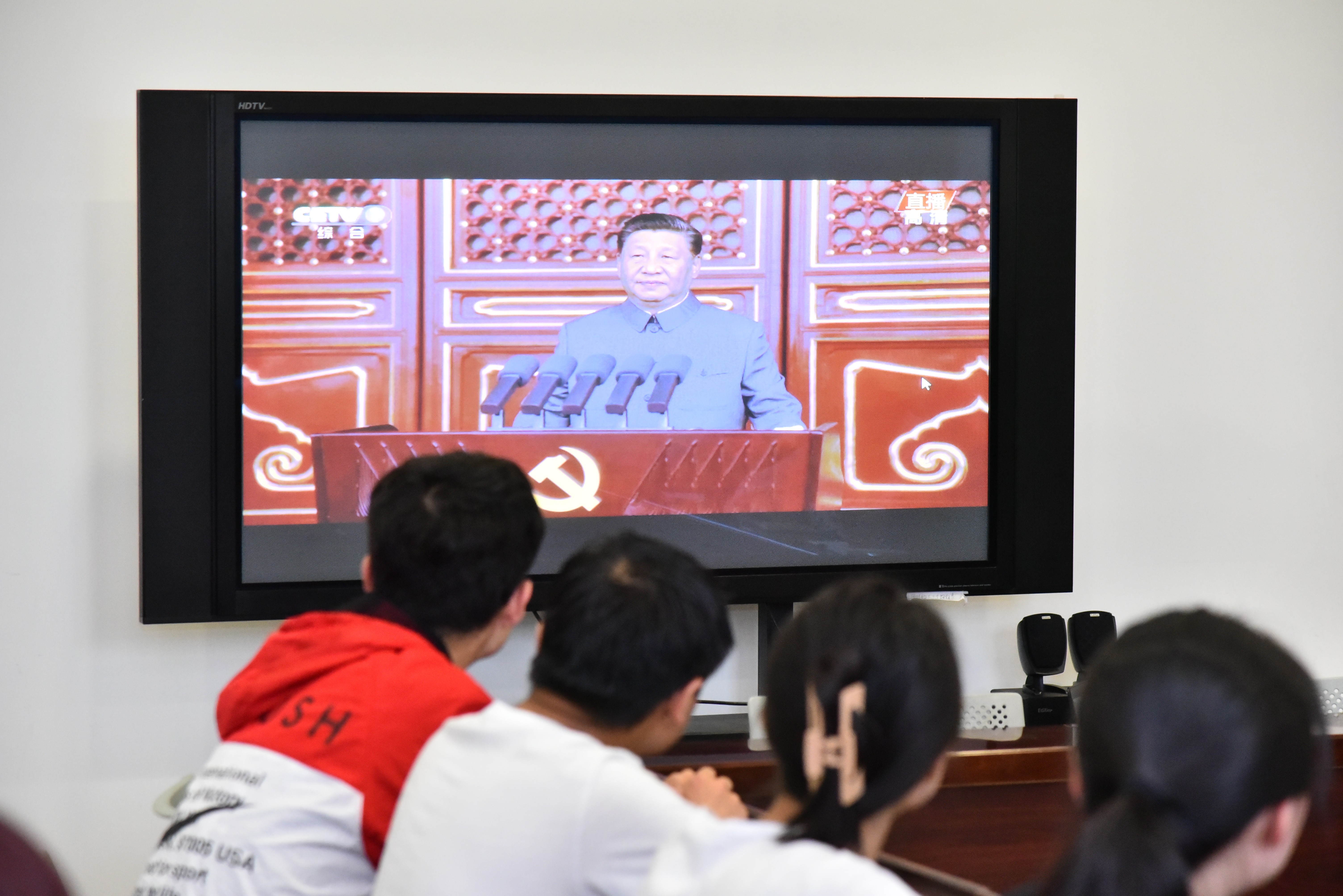7月1日上午8时,校团委组织各职能部门、学生组织同学代表在学生会堂216会议室集中收看庆祝大会直播。