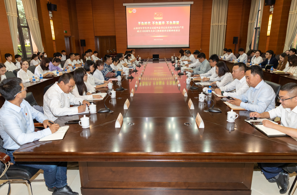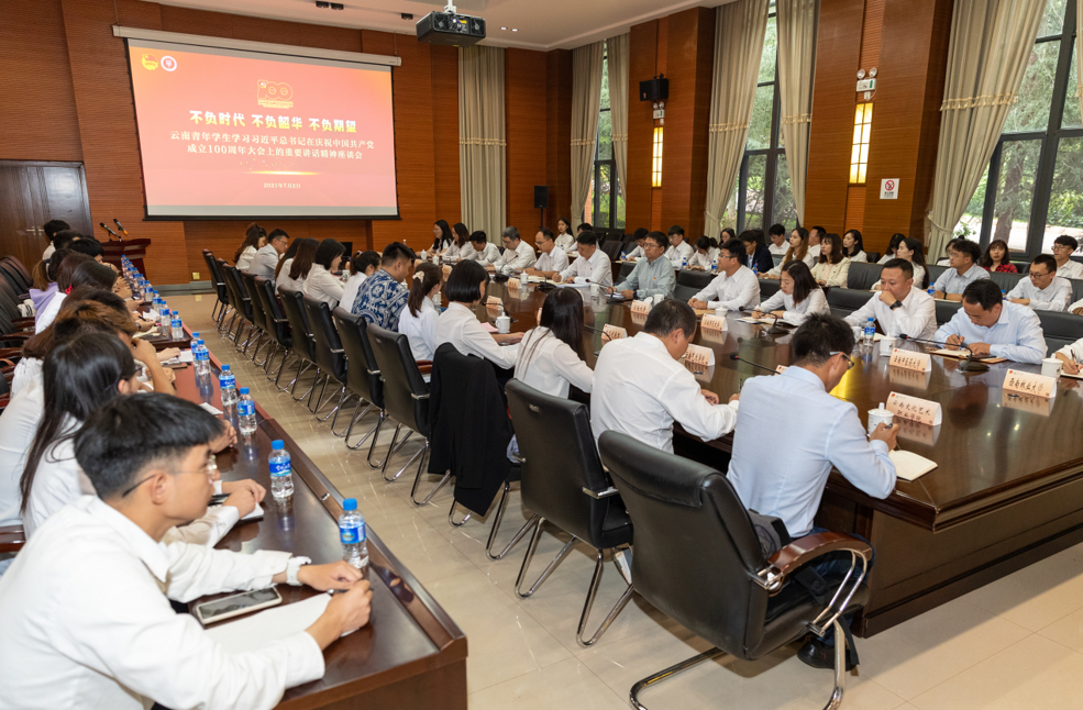 为深入学习贯彻习近平总书记在庆祝中国共产党成立100周年大会上的重要讲话精神,进一步动员和激励广大云岭青年学子弘扬伟大建党精神、牢记使命担当、不负青春韶华,为新时代云南高质量跨越式发展贡献青春力量,2021年7月2日下午,共青团云南省委、云南省学生联合会在云南大学呈贡校区召开学习习近平总书记在庆祝中国共产党成立100周年大会上的重要讲话精神座谈会。