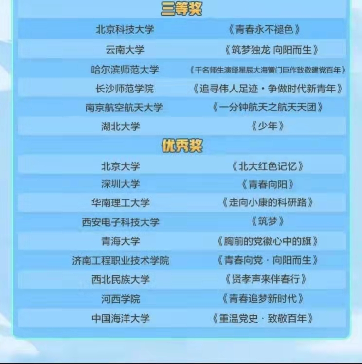 11月3日,由新华网客户端主办的“青春向党·向阳而生”短视频征集大赛正式收官,本次活动有清华大学、北京大学、中国传媒大学等近百所高校参与,经大众网络投票和新华号特邀专家综合评定,从近千件作品中海选精挑出50件入围作品。云南大学选送的《筑梦独龙 向阳而生》从中脱颖而出,荣获三等奖,成为云南高校中唯一获奖单位。