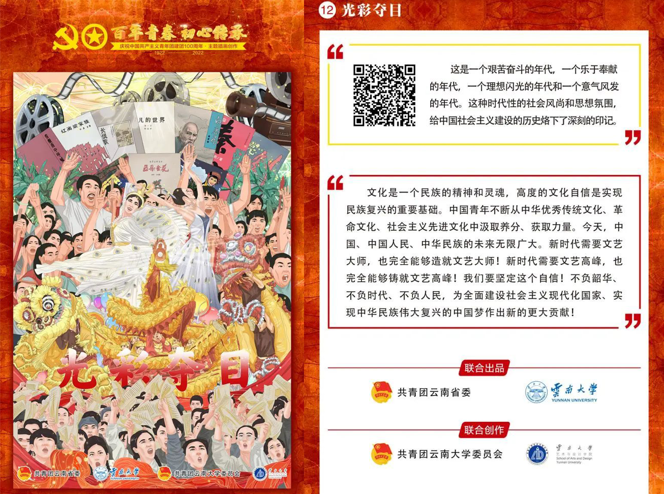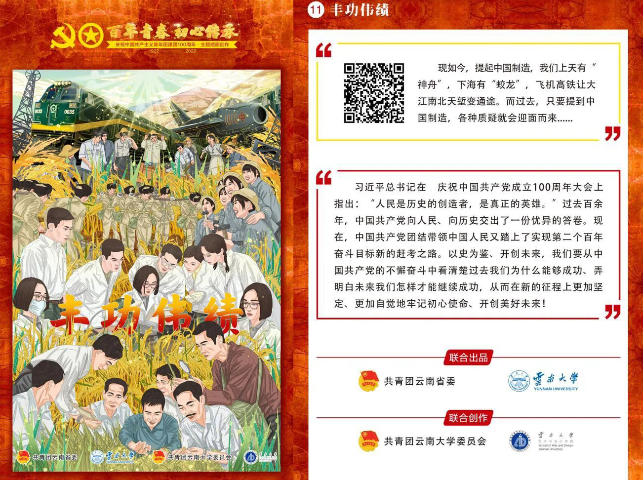 唐源书记一行来到云南大学艺术与设计学院,实地走访了视觉传达系工作室,看望了党的青年运动史文创项目“百年青春,初心传承”系列主题插画创作团队师生,并与大家交流座谈。在中国共产主义青年团成立100周年之际,共青团云南省委联合云南大学推出了“百年青春,初心传承”系列主题插画,艺术与设计学院视觉传达系师生加班加点、保质保量地完成了创作任务,作品在云南共青团“喜迎二十大 永远跟党走 奋进新征程”主题展中集中展出,并形成一系列精品网络原创推文,深受广大青年的喜爱与好评。