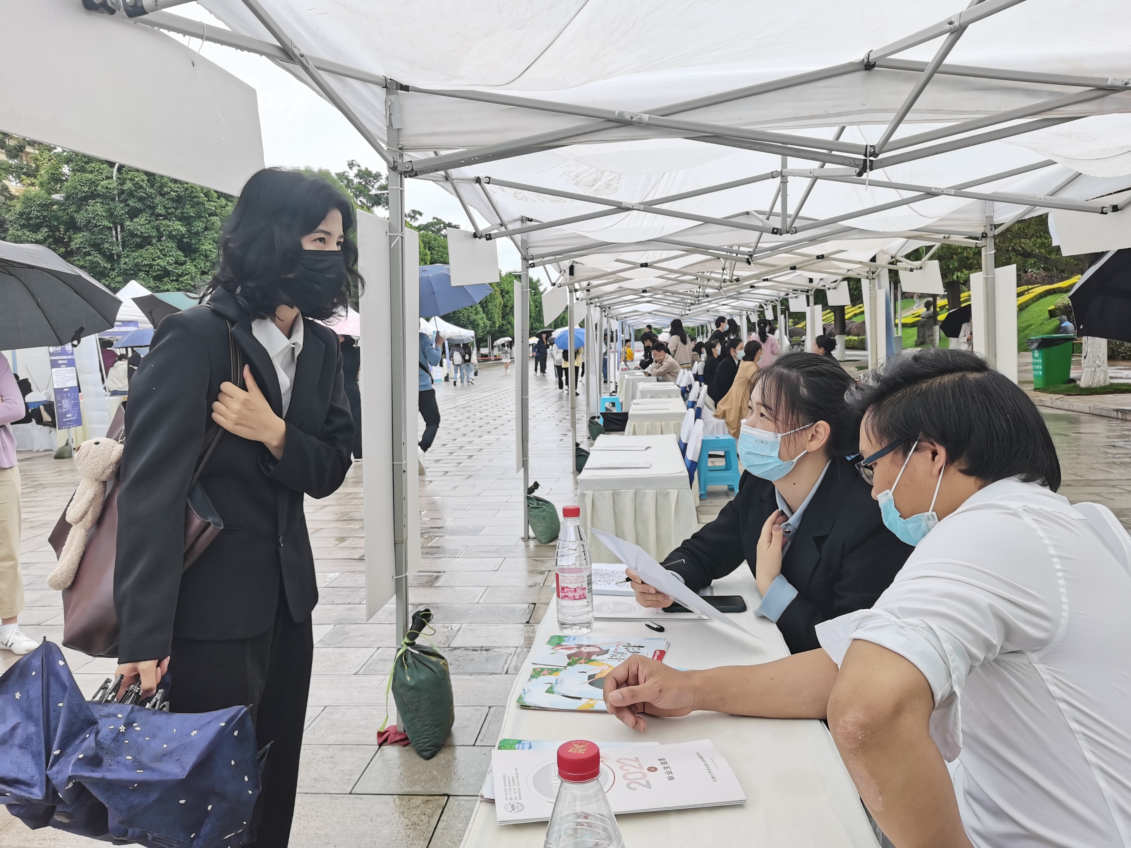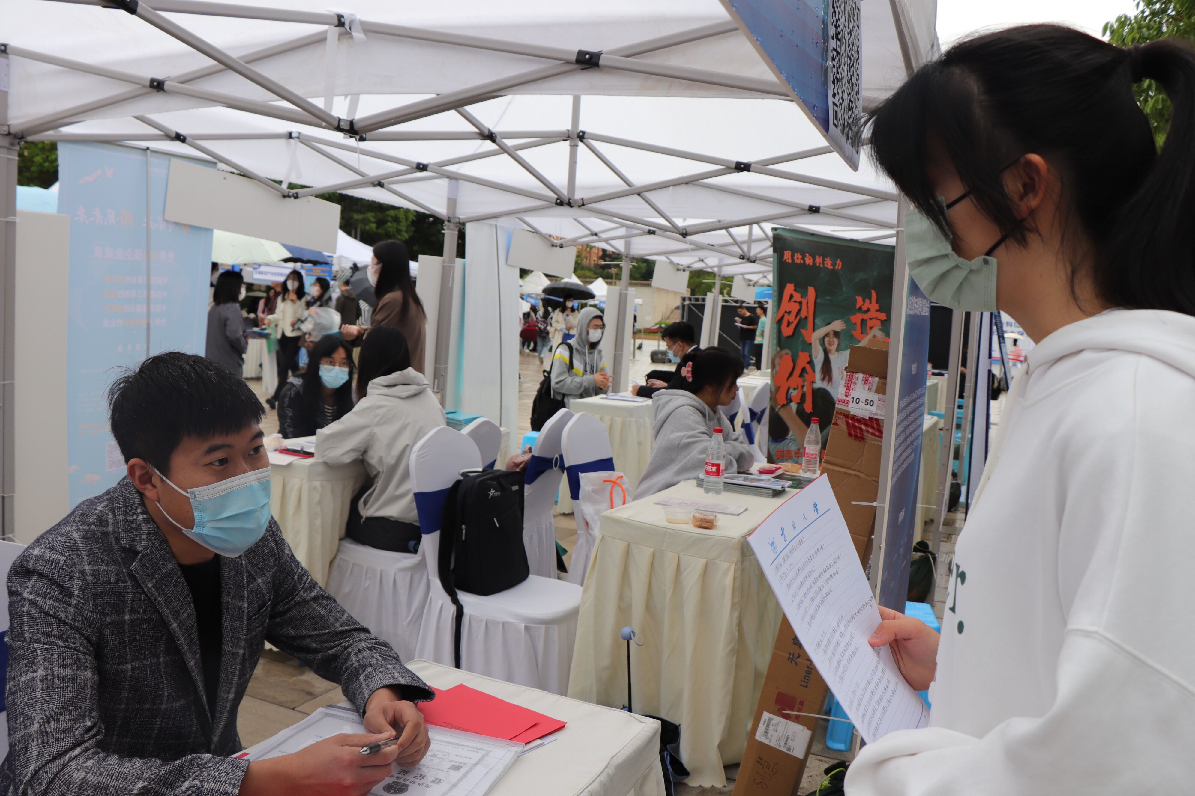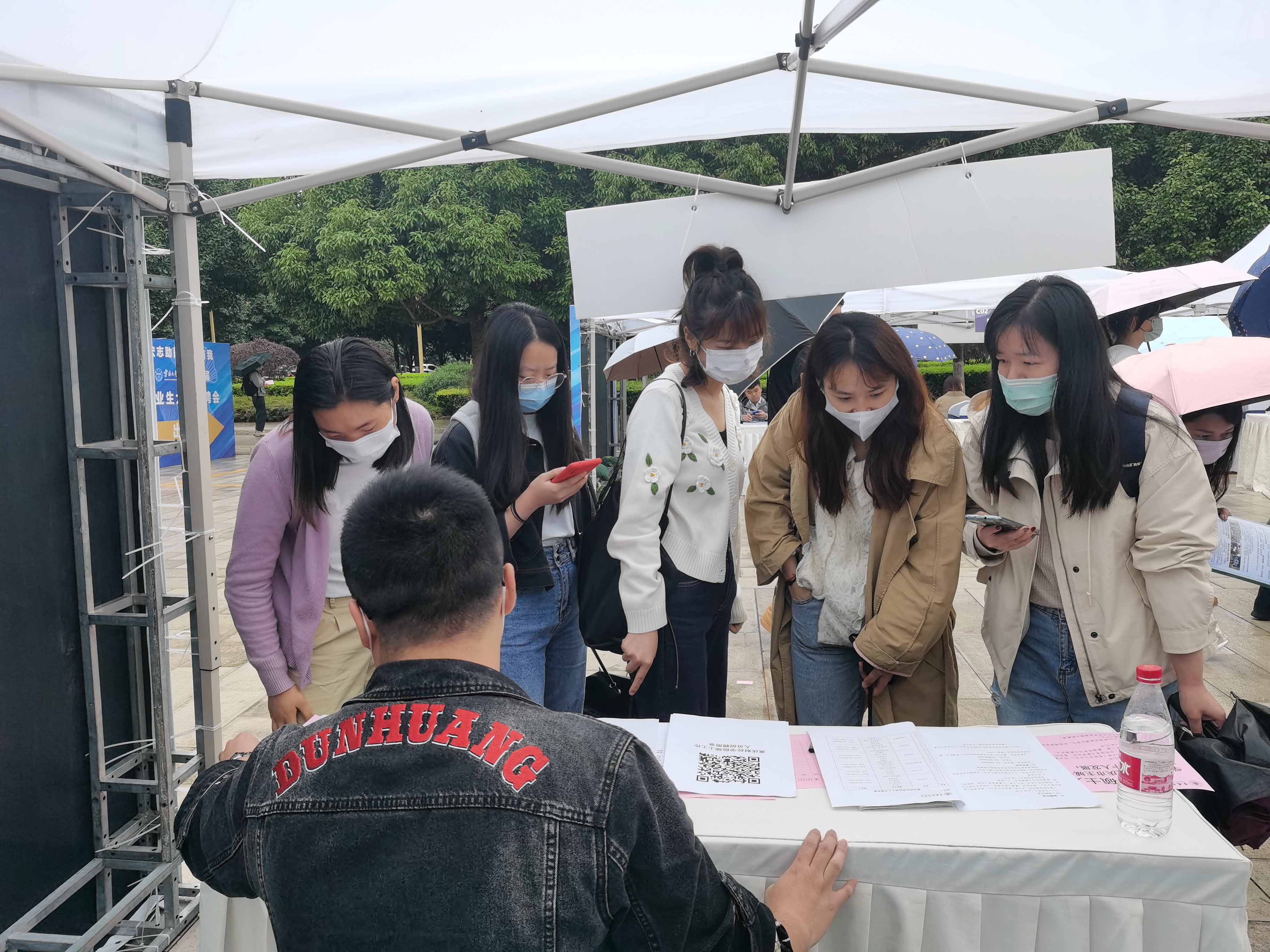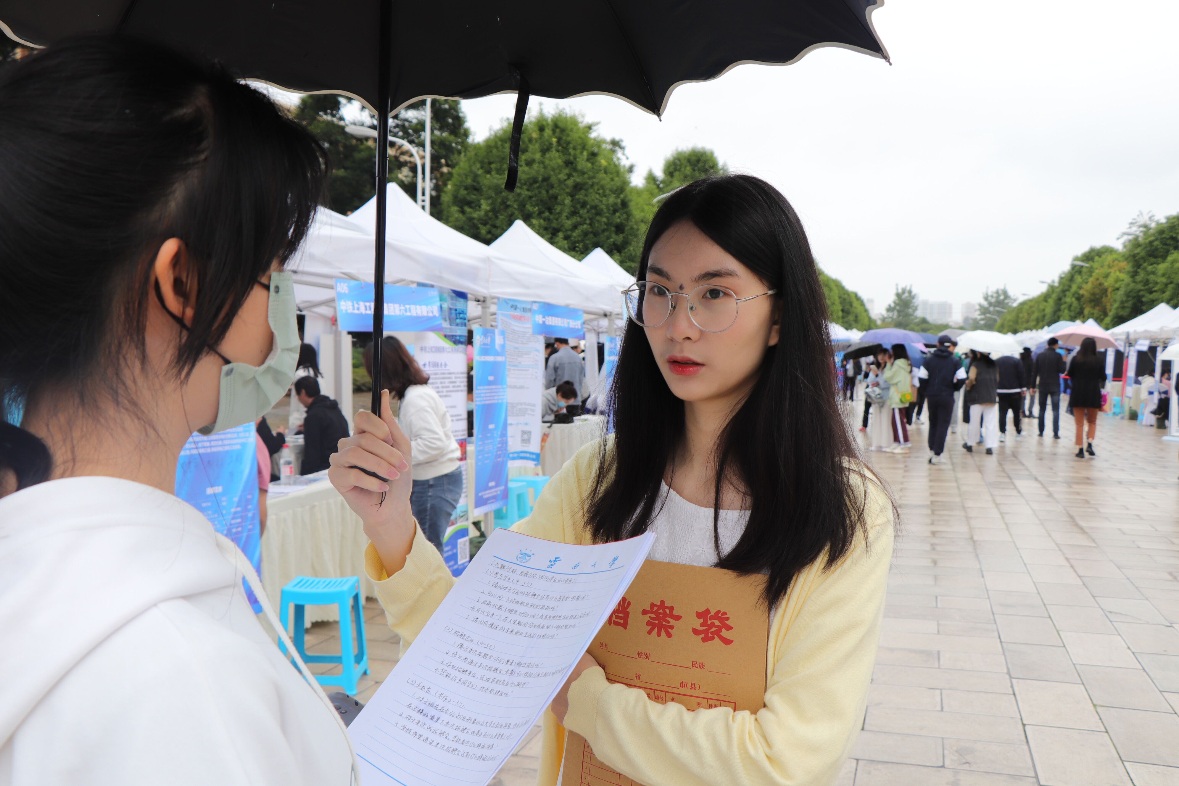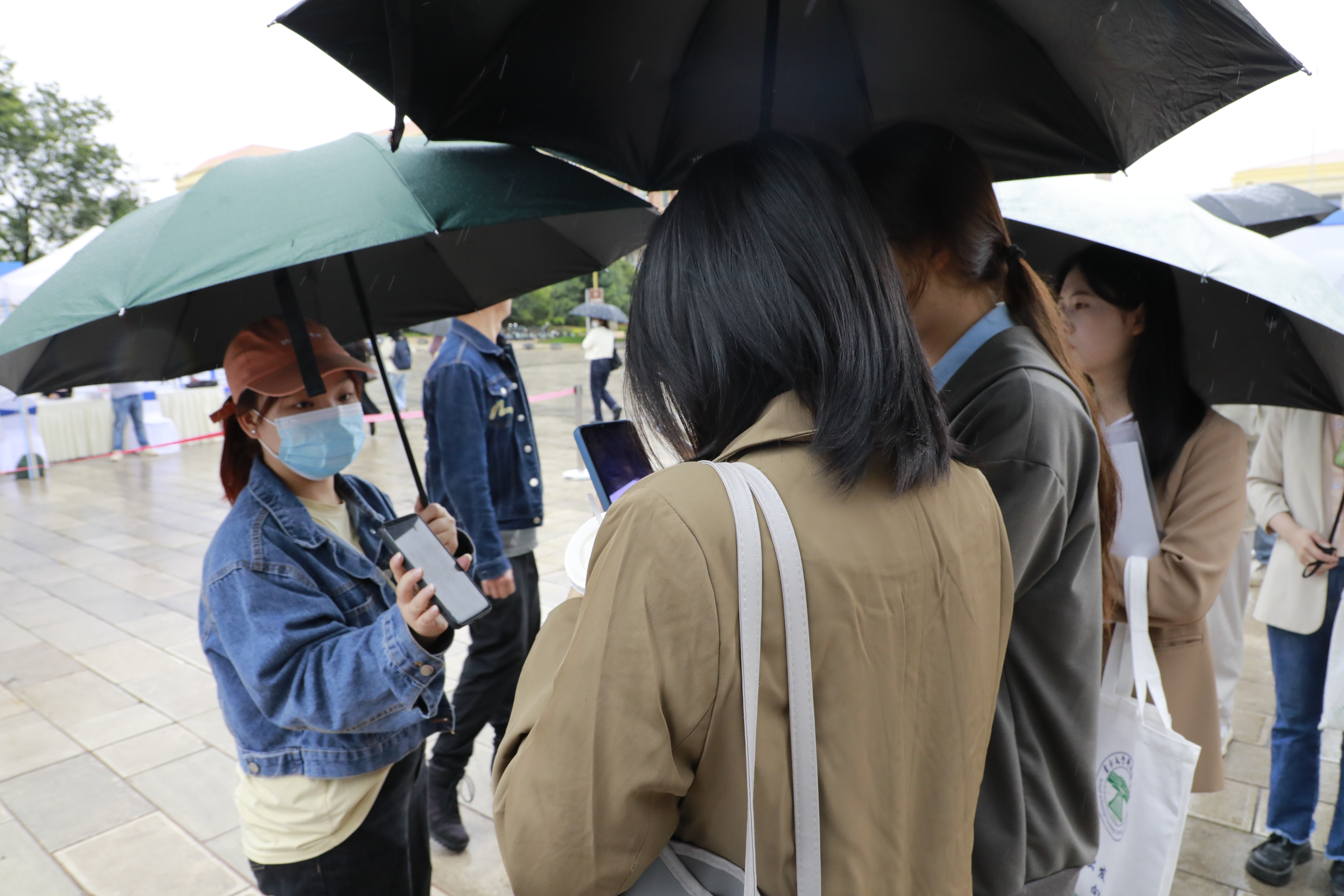 来自多个地区的企事业单位参加了招聘活动。本次双选会有注册地为北京、上海、广东、四川、重庆、福建、广西、河南和云南等9个省市的127家优质单位到场招聘,提供岗位4330个,平均月薪6800元,涉及教育、科学研究、制造业、金融业和技术服务业等16个行业。天雨微凉,但同学们的热情很高,大家撑着雨伞、戴着口罩,在双选会入口处有序排队,扫码入场。