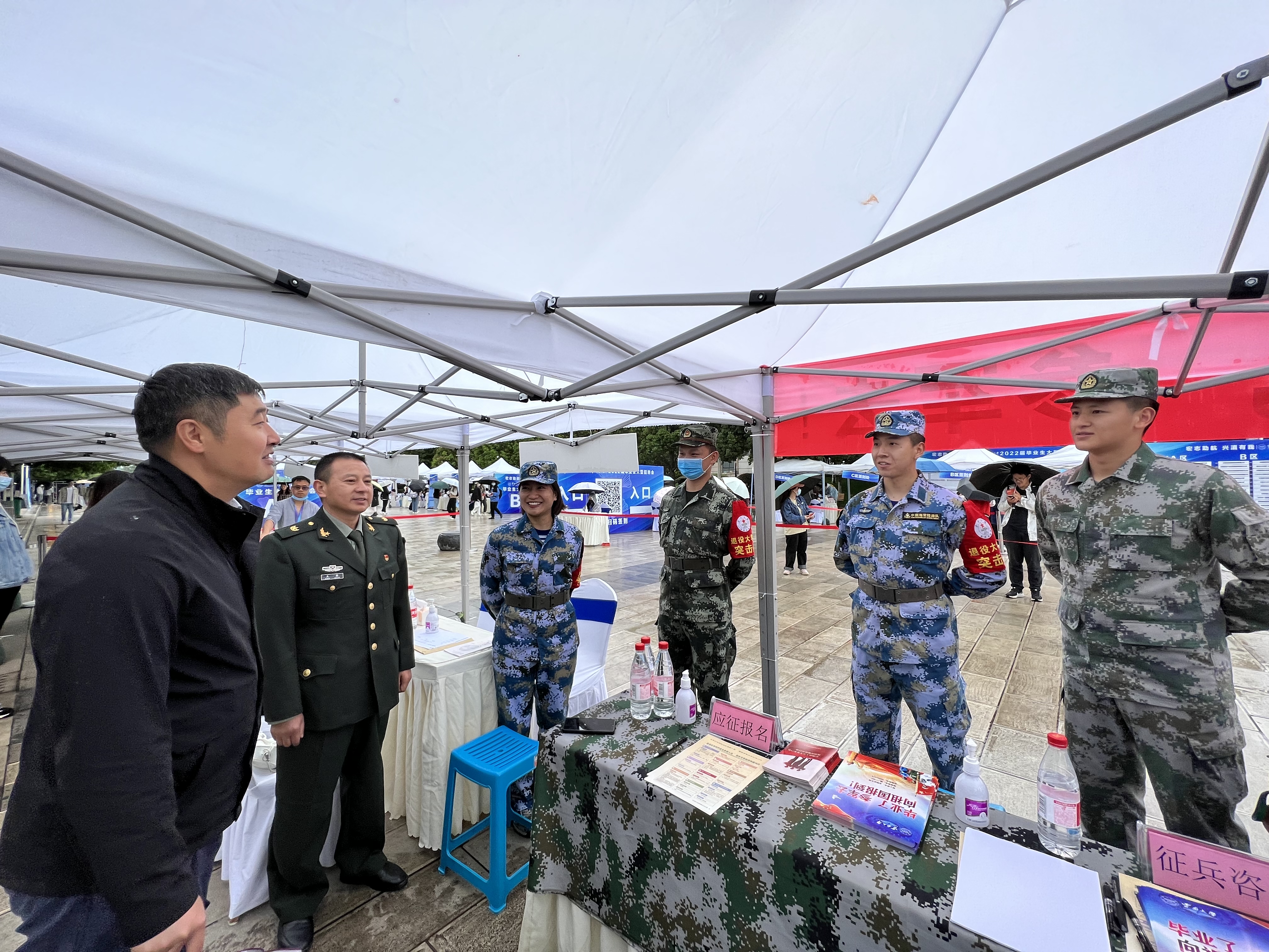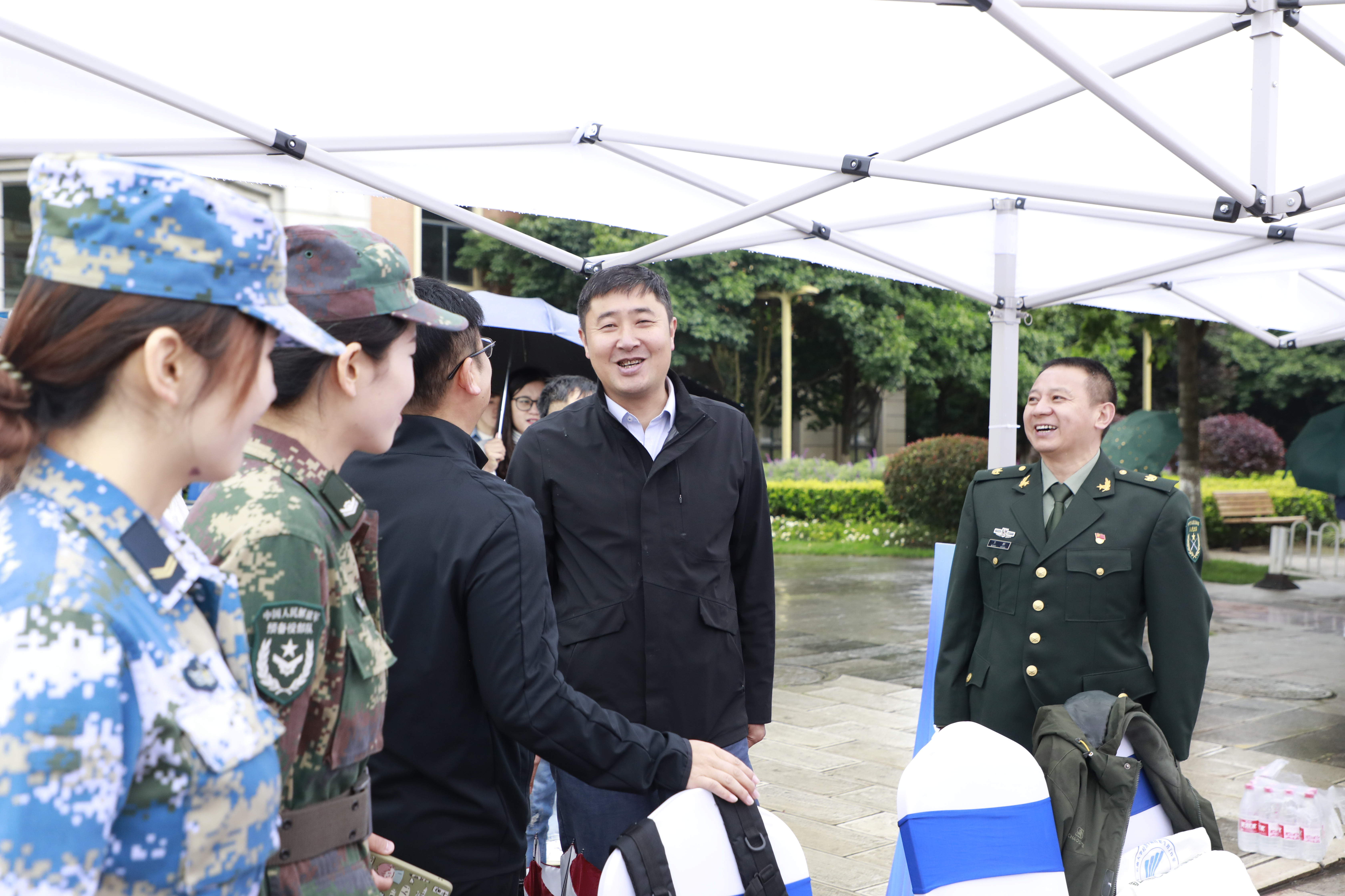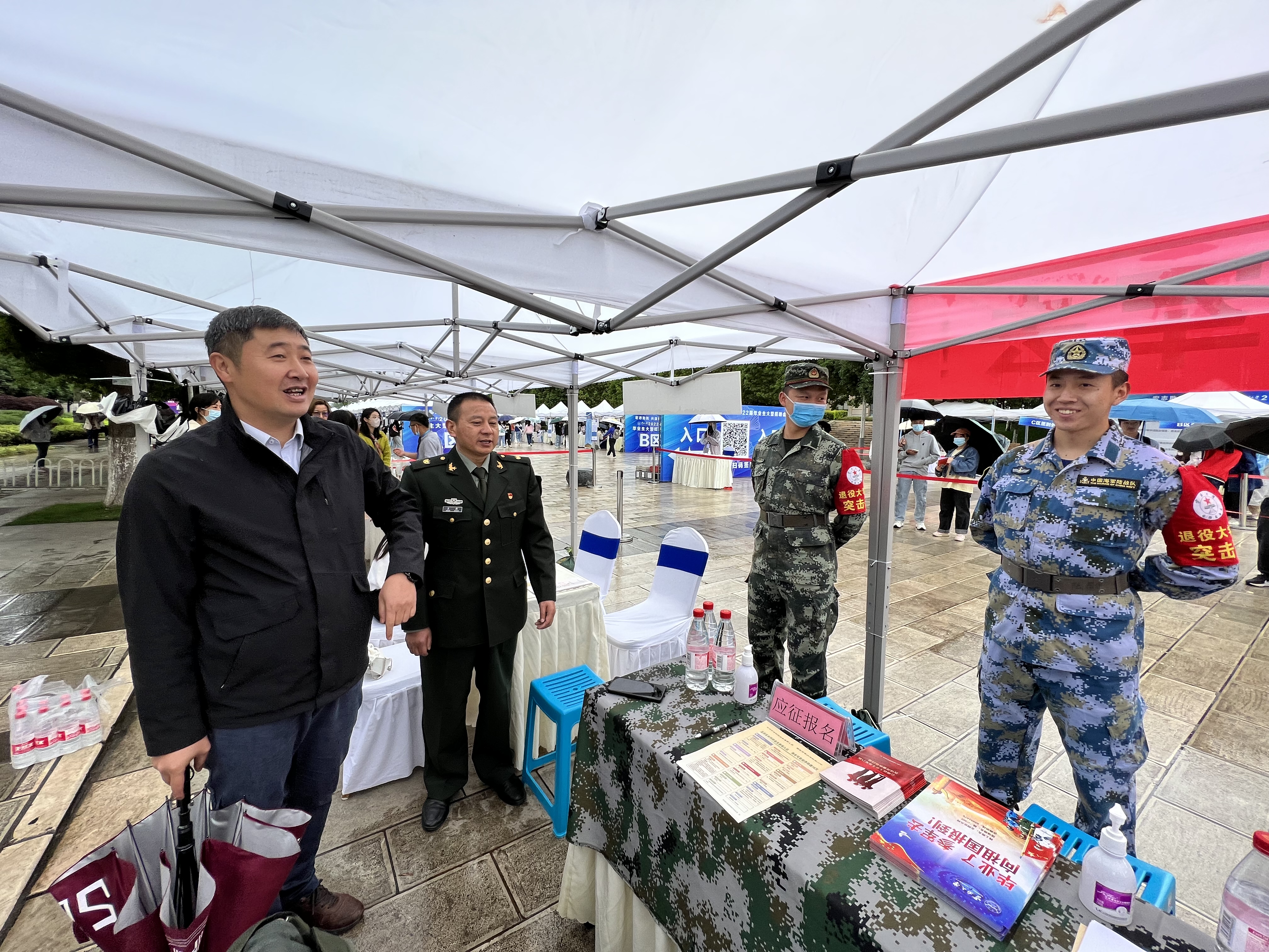 在经过征兵宣传展位时,唐源书记与云南大学学生社团“国防后备连”退役青年学子亲切交流,了解他们在部队的经历与收获,关心他们退役返校后的学习生活状况,并对他们参军报国的选择表示赞赏和肯定。他说,参军可以培养爱国情怀,并且能为人生带来一段精彩的经历。当看到有意愿咨询参军报名的同学前来询问,唐源书记肯定了她们的崇高志向,并祝愿她们早日实现自己的从军梦想。