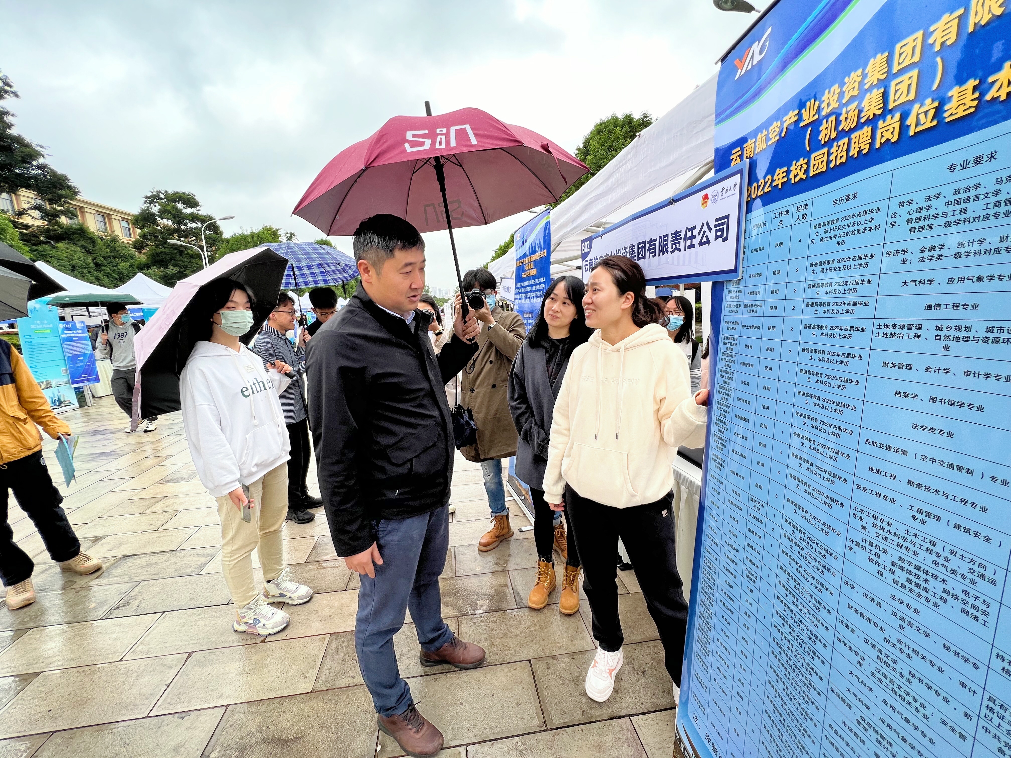 当天上午,共青团云南省委唐源书记来到活动现场,实地了解双选会开展与应届生就业情况。他走到招聘企事业单位展位前,仔细查看海报及宣传资料,并与单位招聘工作人员深入交谈,详细了解单位规模、招聘政策、用人需求、发展前景、薪资待遇等方面信息。唐源书记叮嘱,一定要精准、精细、精心,想尽办法为高校应届毕业生就业择业创造条件、提供机会,全力为2022届毕业生的顺利就业保驾护航。