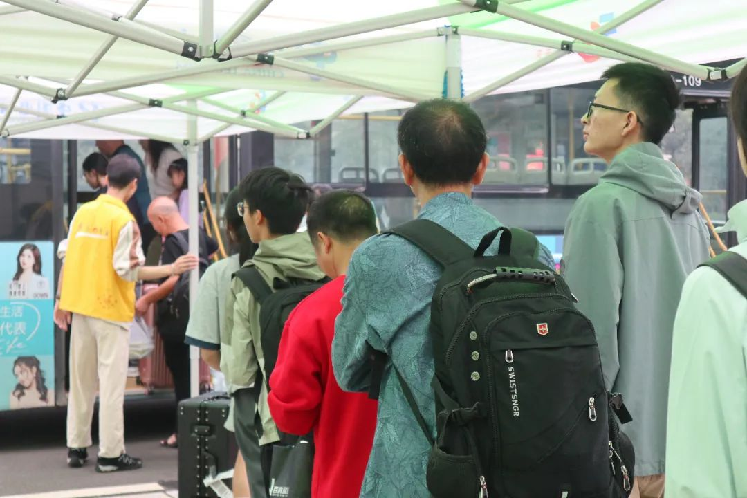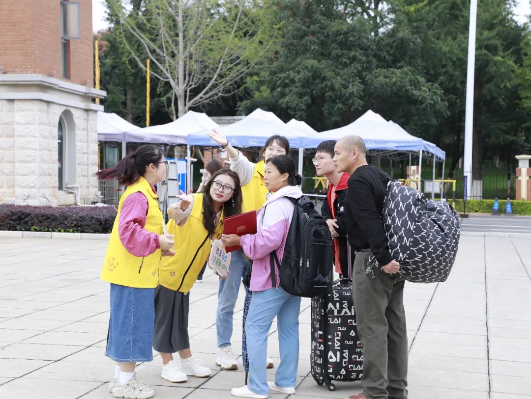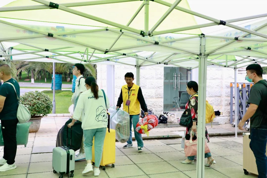 新生抵达校门,便会有志愿者们帮忙搬运行李,引导新生及家长入校,入校后,接驳车便将新生们送到各自的宿舍楼。