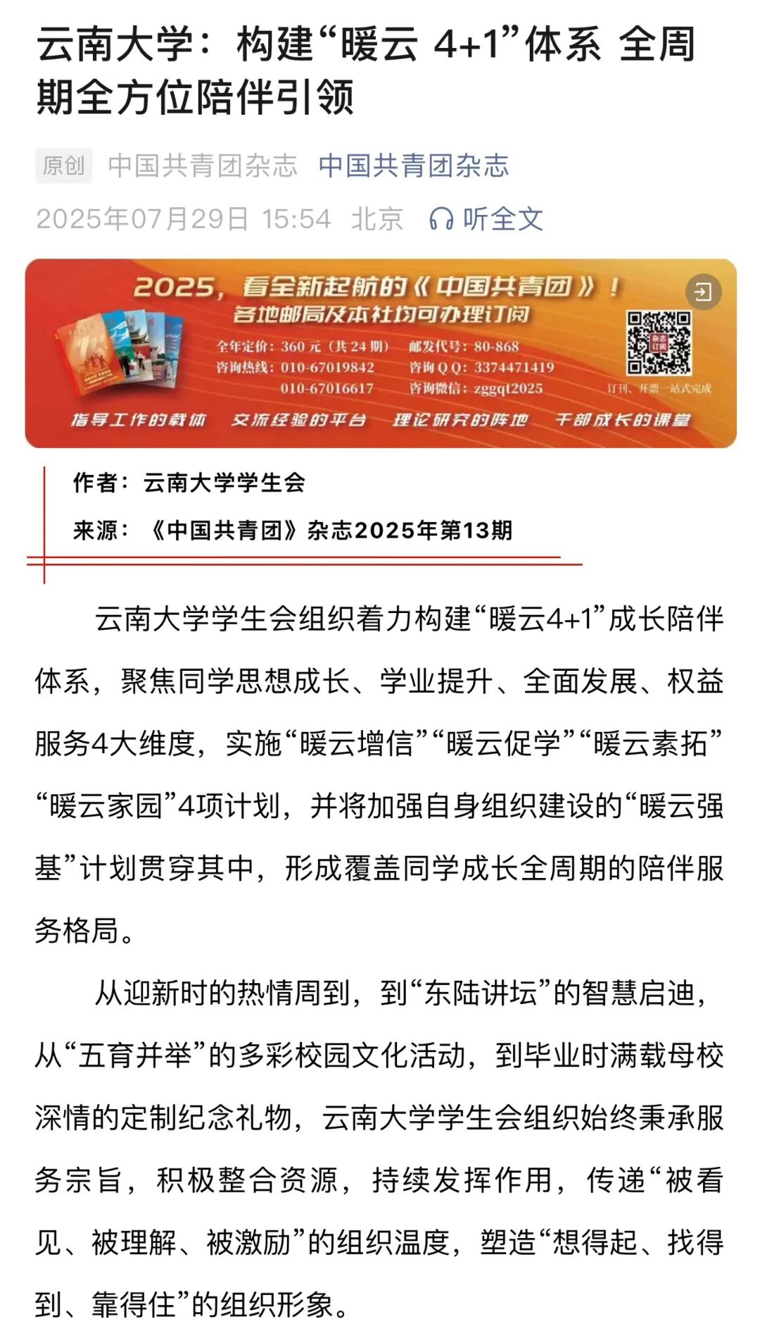 云南大学学生会组织着力构建“暖云4+1”成长陪伴体系,聚焦同学思想成长、学业提升、全面发展、权益服务4大维度,实施“暖云增信”“暖云促学”“暖云素拓”“暖云家园”4项计划,并将加强自身组织建设的“暖云强基”计划贯穿其中,形成覆盖同学成长全周期的陪伴服务格局。