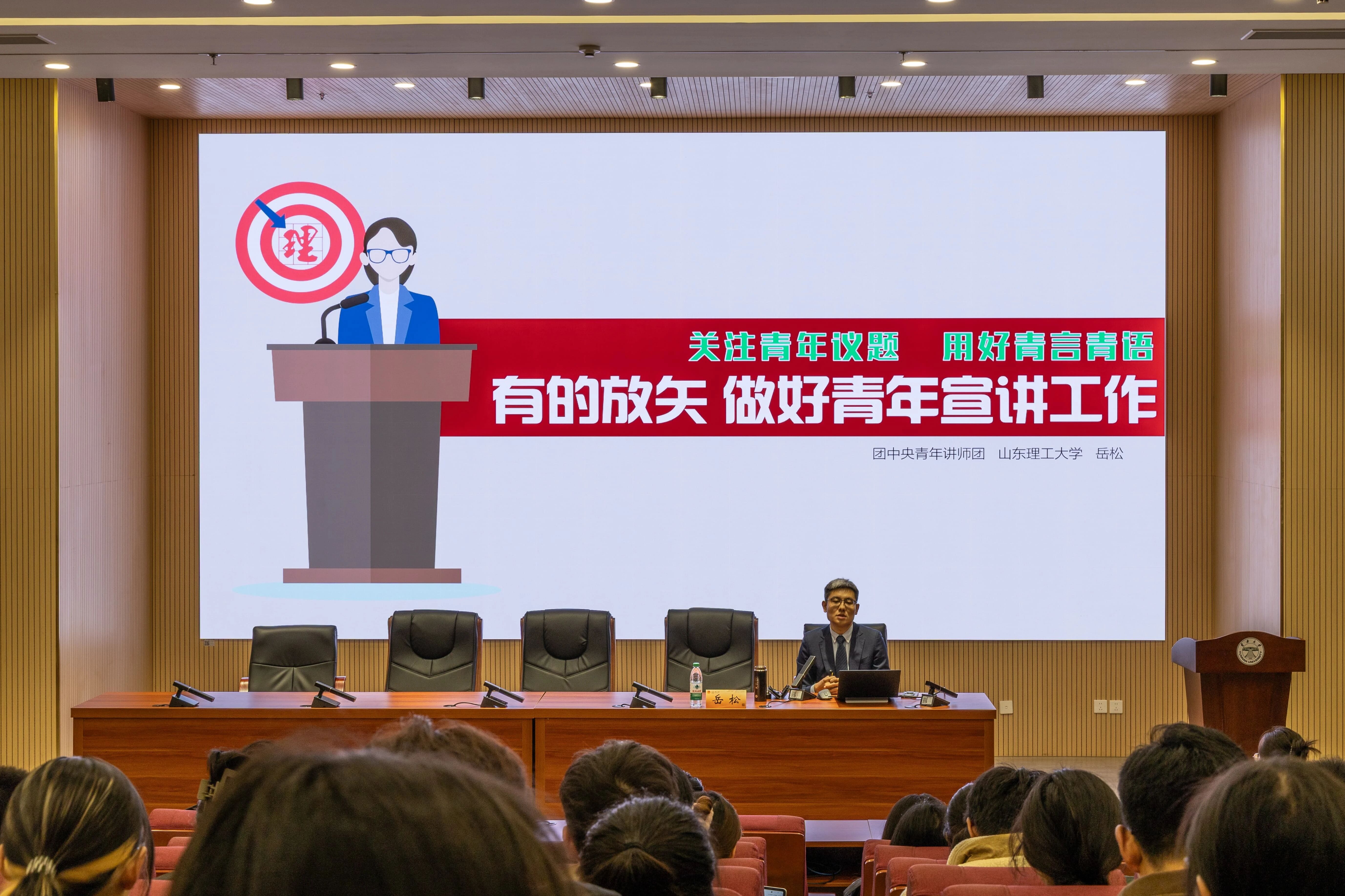 山东理工大学马克思主义学院岳松教授做题为《关注青年议题,用好青言青语——有的放矢做好青年宣讲工作》专题讲座。岳松教授从表演、演讲、教学、倾诉等维度深入分析宣讲性质,提出“宣讲是一次目标明确的诚挚分享”,并从受众认知链与当代青年特点入手,为青年讲师团成员更好实现宣讲效果提出针对性建议与具体操作方法,做到“八有”,让理论宣讲入脑入心。