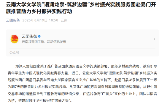 2025年7月13日至19日,云南大学文学院“语润龙泉·筑梦边疆”乡村振兴实践服务团队赴云南省玉溪市易门县龙泉镇展开了一场为期7天的推普助力乡村振兴实践行动。从文化广场的方言调查到暑期课堂的诗词朗诵,从野生菌交易市场的沟通指导到主题教育馆的感悟分享,在这片孕育了“菌乡”文化的土地上,团队以语言为桥,搭建起通往乡村振兴的“沟通之梁”。此次实践,团队共计发放推普宣传册和调查问卷各百余份,覆盖约500人次,撰写实践日志63篇,见证了国家通用语言文字普及在促进民族交往交流交融、赋能地方产业发展以及铸牢中华民族共同体意识中的基础性作用,相关事迹获云团头条等媒体报道,实现了良好的社会效果和育人成效。