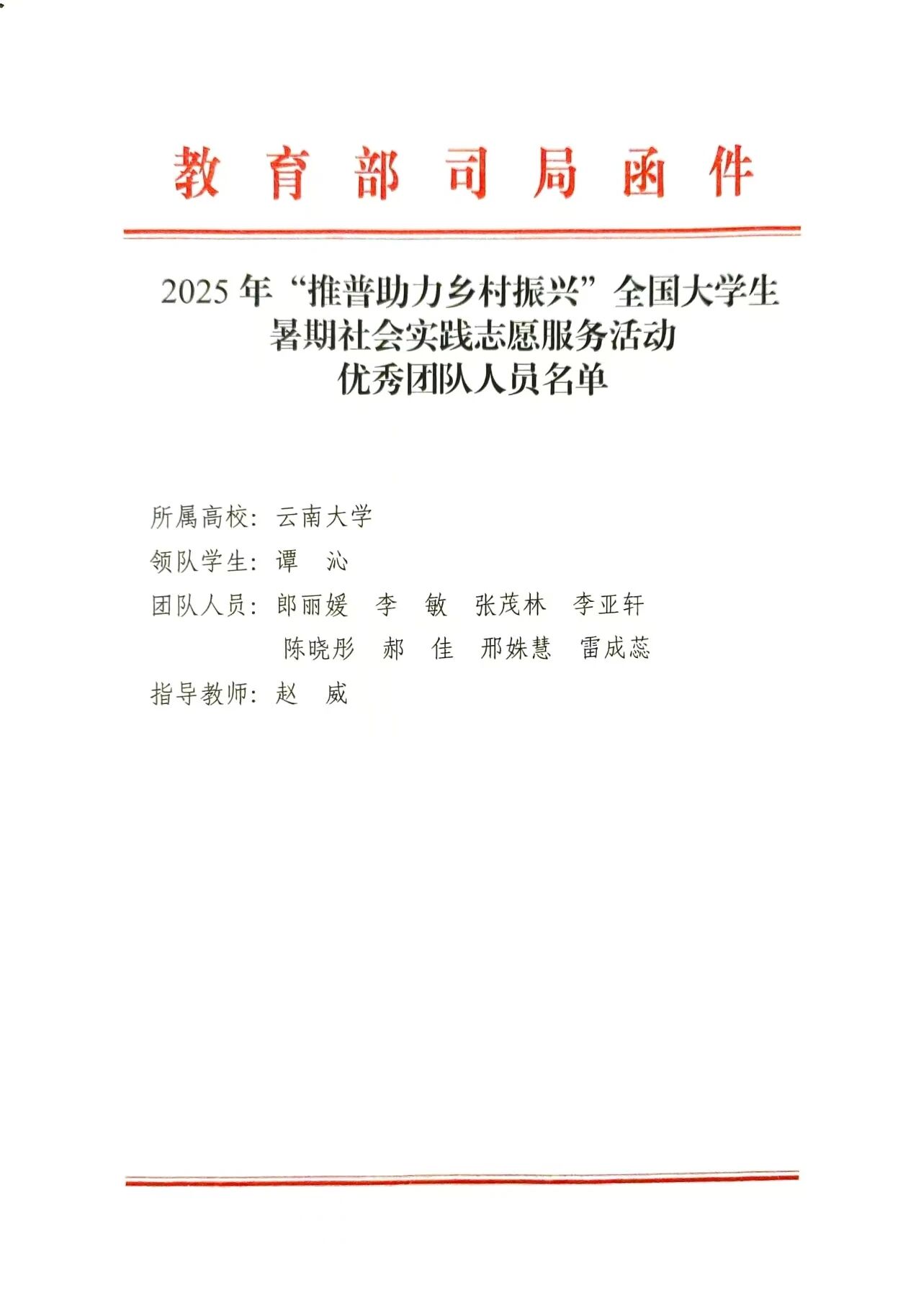 近日,2025年“推普助力乡村振兴”全国大学生暑期社会实践志愿服务活动优秀团队人员评选结果揭晓,云南大学收到教育部语言文字应用管理司、团中央青年发展部来函,对我校在本次活动中高度重视、精心组织给予肯定。我校“语润龙泉·筑梦边疆”乡村振兴实践服务团队获评优秀团队。