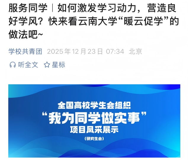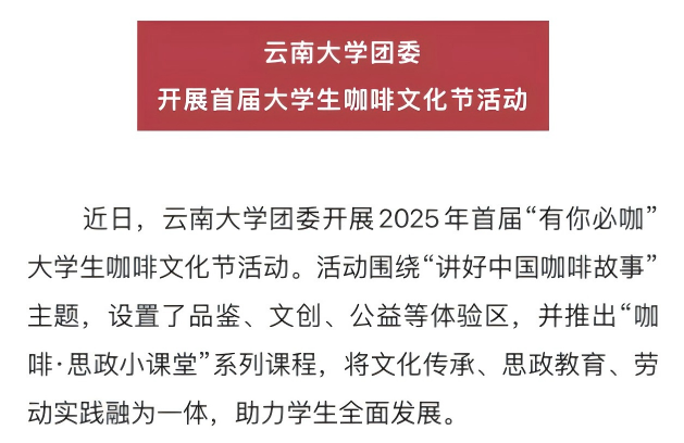 近日,云南大学“暖云促学”计划与首届大学生咖啡文化节两项活动,相继获得共青团中央官方平台“学校共青团”微信公众号的报道。两项活动深度融合文化育人理念,体现了云南大学校园中勤学与活力交融的冬日景象。