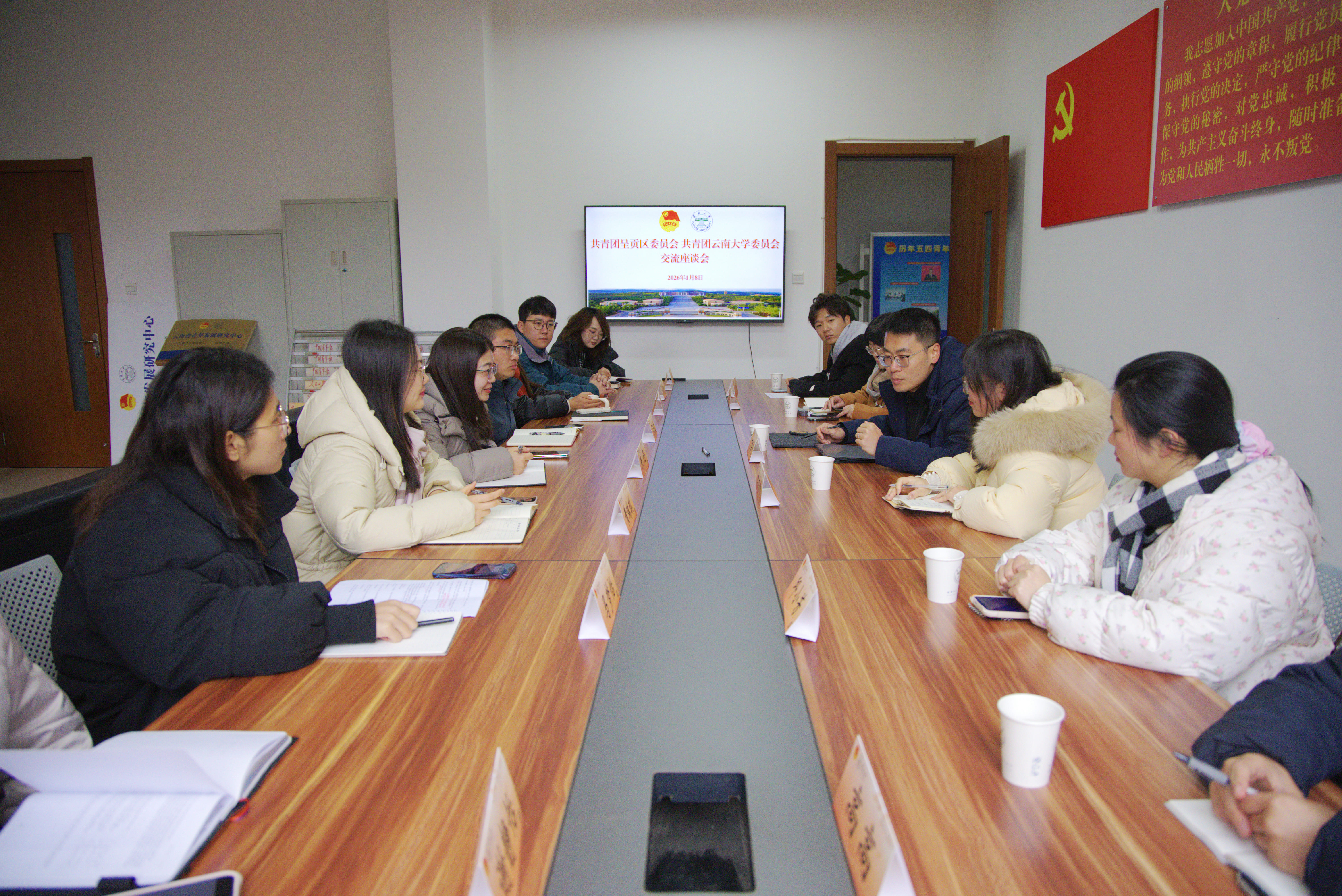 2026年1月8日,呈贡团区委与云南大学团委举行交流座谈会。呈贡团区委书记丁楷伦、呈贡团区委副书记李茹曦、云加益项目负责人杨蕾、云南大学团委副书记朱丹、吴挺立、黄瑞琪及全体工作人员参会。
