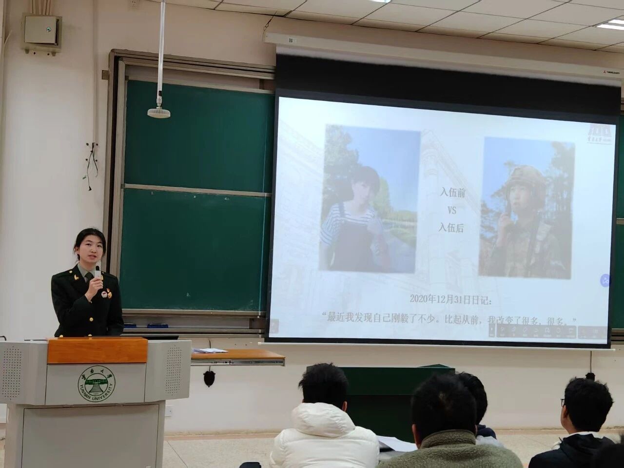 为深入开展爱国主义教育,引导青年学生树立家国情怀,明确新时代青年的责任担当,2025年12月7日军理课期间,段润芝同学面向建设与规划学院、商旅学院大一本科生开展主题宣讲。段润芝同学结合自己主动应征入伍、驻守西藏边防的亲身经历,生动讲述了在高寒缺氧、条件艰苦的边疆军营中训练执勤、参与边境任务、保障生命线的坚守故事,并分享其退伍后返校继续发扬军队作风、投身国防教育与学生工作的实践。活动紧扣“有理想、敢担当、能吃苦、肯奋斗”的新时代好青年内涵,以云南大学多年生稻团队等为例,激励学子将个人理想融入国家事业,在艰苦奋斗中书写青春。宣讲以真实感人的军营叙事和发人深省的价值引领,为新生上了一堂生动的爱国主义教育课,有效增强了学生的爱国拥军、奉献意识与使命责任感。