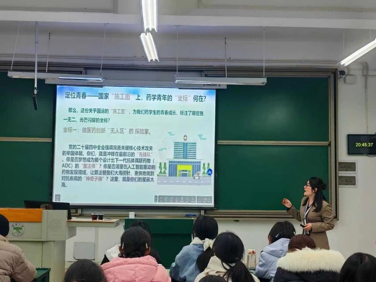 为深入学习贯彻党的二十届四中全会精神,引领青年学子将专业学习融入国家发展大局,2025年12月,黄惠老师来到药学院开展主题宣讲。宣讲紧密围绕“健康中国”建设,深刻阐述药学在保障国家医药战略安全、攻克关键核心技术、优化全民健康服务体系中的“芯片”与“弹药库”作用。宣讲提出了以坚定理想信念为“核心指令”、跨界学习与躬身实践为路径的“成长行动算法”,有效激发了药学青年的使命感与专业认同感,引导他们将“人民健康”写入奋斗底色,立志成为服务国家战略需求、护航人民生命健康的“智慧创药人”。