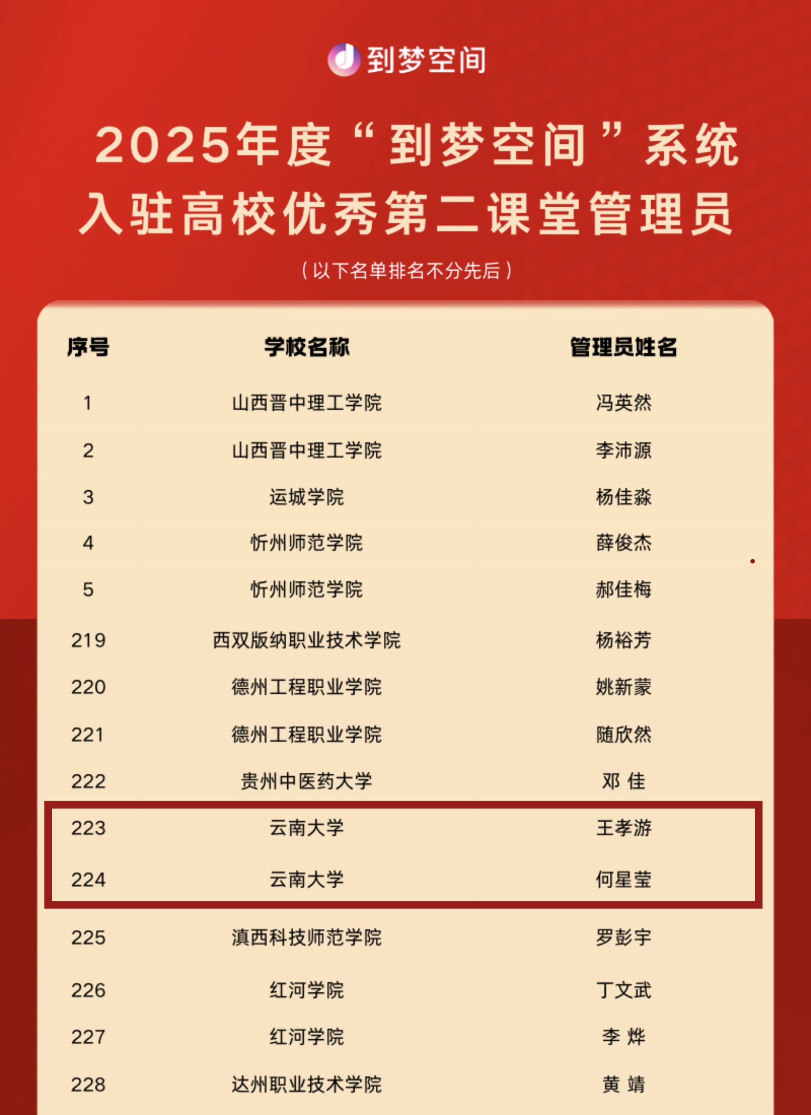 近日,为深入贯彻落实立德树人根本任务,深化高校共青团“第二课堂成绩单”制度实施,到梦空间系统运营中心组织开展了2025年度入驻高校优秀第二课堂管理团队及管理员评选活动。经过严格评审、复核与审定,在千余份申报材料中,共评选出148支优秀第二课堂管理团队。其中,云南大学第二课堂成绩认证管理中心荣获“优秀第二课堂管理团队”称号,云南大学第二课堂成绩认证管理中心成员何星莹、王孝游获评“优秀管理员”。