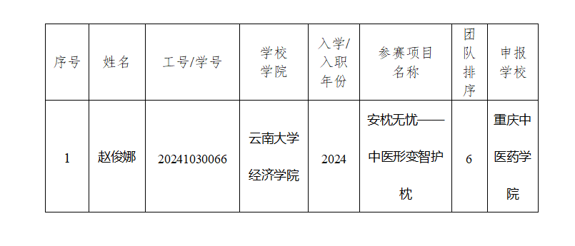 按照团中央《关于组织开展第十五届“挑战杯”中国大学生创业计划竞赛重庆市选拔赛的通知》要求,多个学校老师或学生合作申报的作品,须在老师或学生所在学校进行公示。现由我校一位同学跨校参加的《安枕无忧—中医形变智护枕》项目拟由重庆中医药学院推荐至省级组委会,按照相关规定对参赛学生信息公示如下: