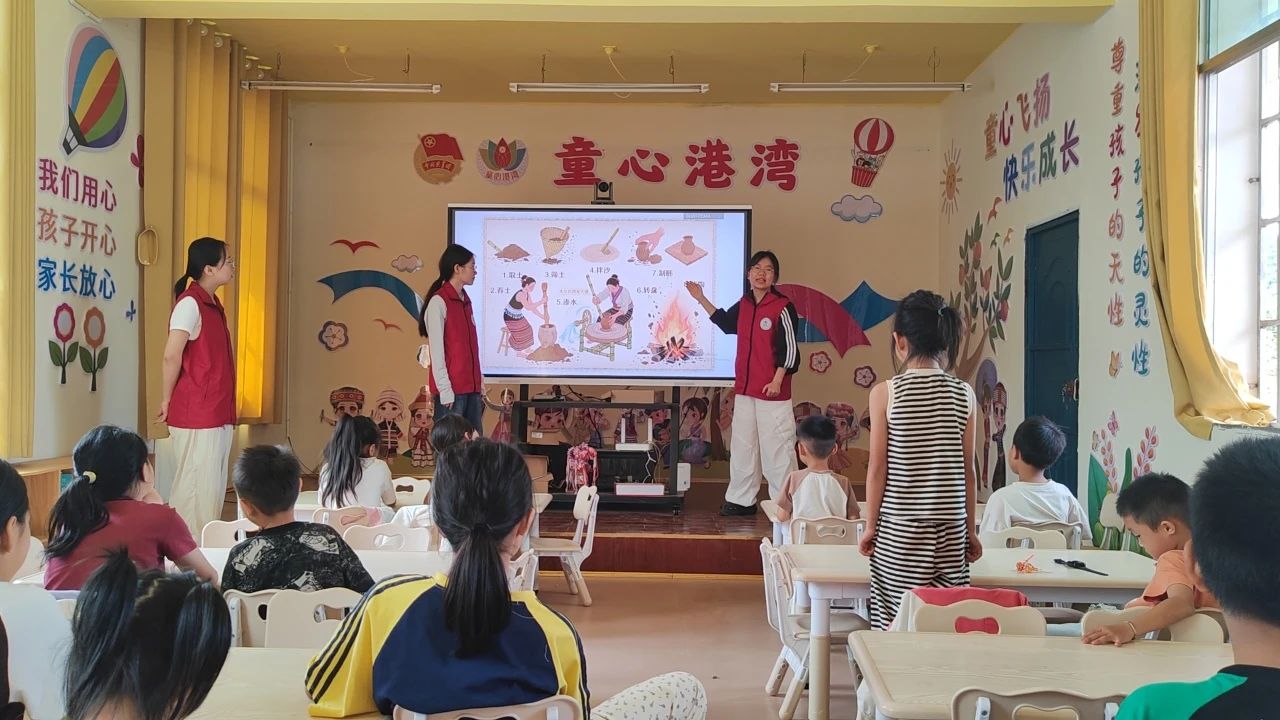 在曼方村委会童心港湾,团队成员采用普通话共读《非遗传薪》绘本的形式,带领孩子们走进当地的非遗文化世界,了解独特的民族特色。在共读过程中,团队成员通过打造沉浸式的民族文化画卷,引导孩子们感受民族文化魅力,铸牢各民族要像石榴籽一样紧紧抱在一起的中华民族共同体意识,坚定共同携手助力民族团结进步的理想信念。