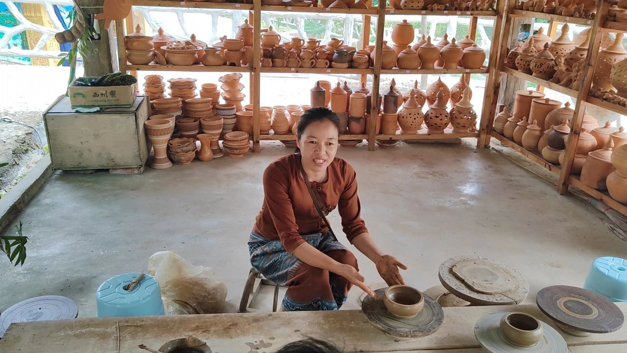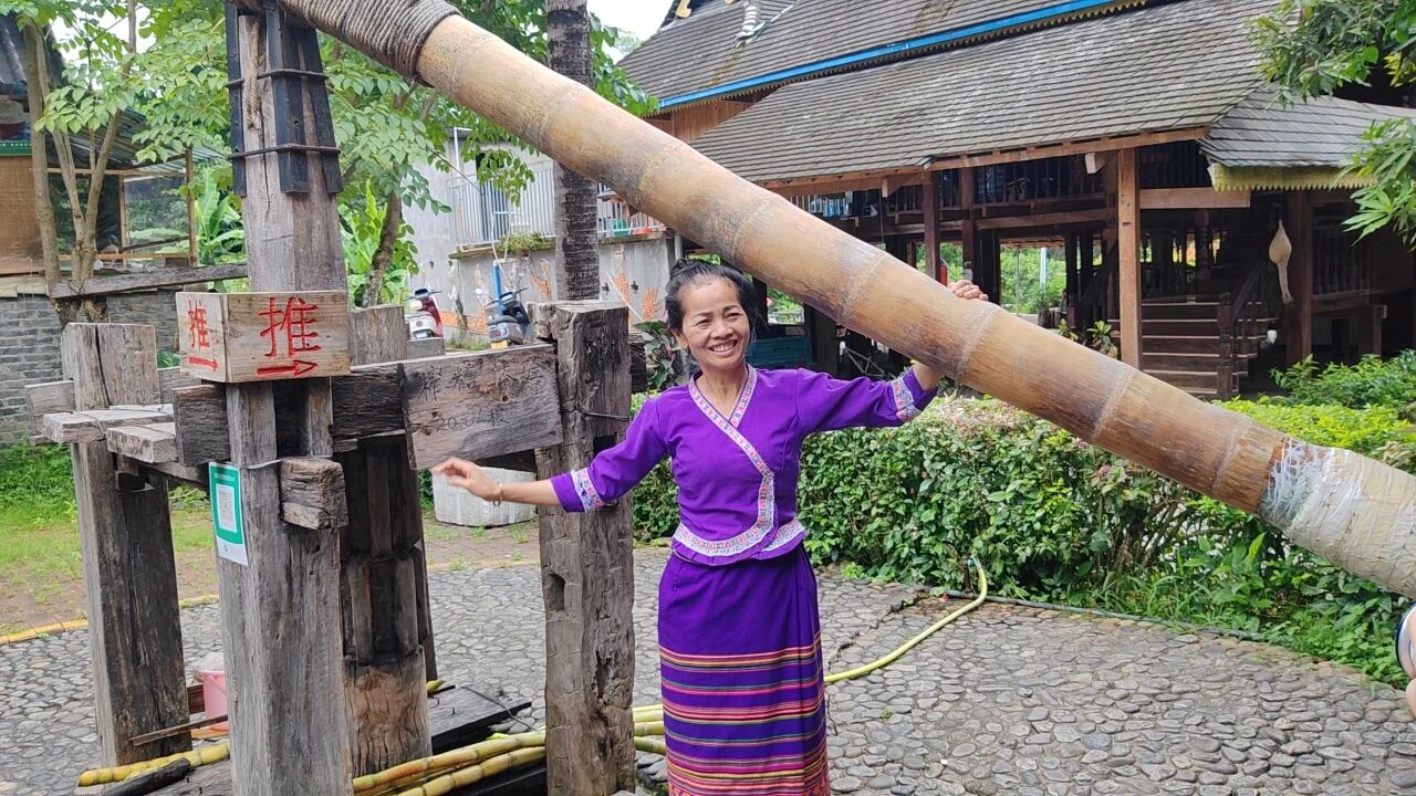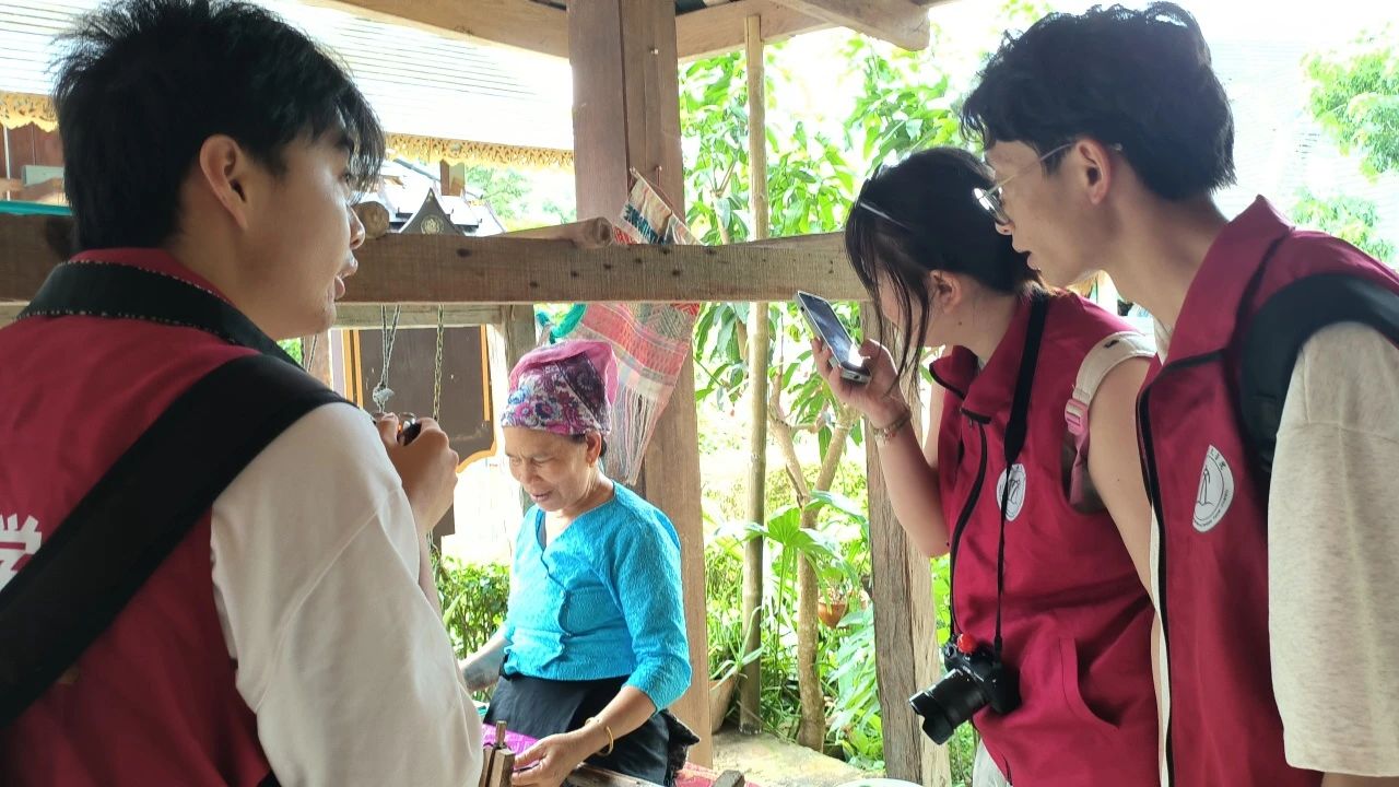 在曼方村村委会,团队成员有幸聆听了党总支书记岩龙演唱的傣族章哈。岩龙书记作为当地著名的非遗传承人,巧妙地将非遗传承与政策宣讲相结合,通过悠扬的章哈演唱,传达习近平总书记“绿水青山就是金山银山”的生态文明建设理念,让在场的众人深受启发。随后,团队走访了勐景来村制糖、酿酒、傣陶、傣锦等多个非遗工坊。通过记录老艺人的技艺故事,鼓励他们用普通话讲述“老手艺”背后的文化内涵。傣锦传承人表示:“以前只懂做手艺,现在能用普通话讲我们的文化,感觉特别有意义。”