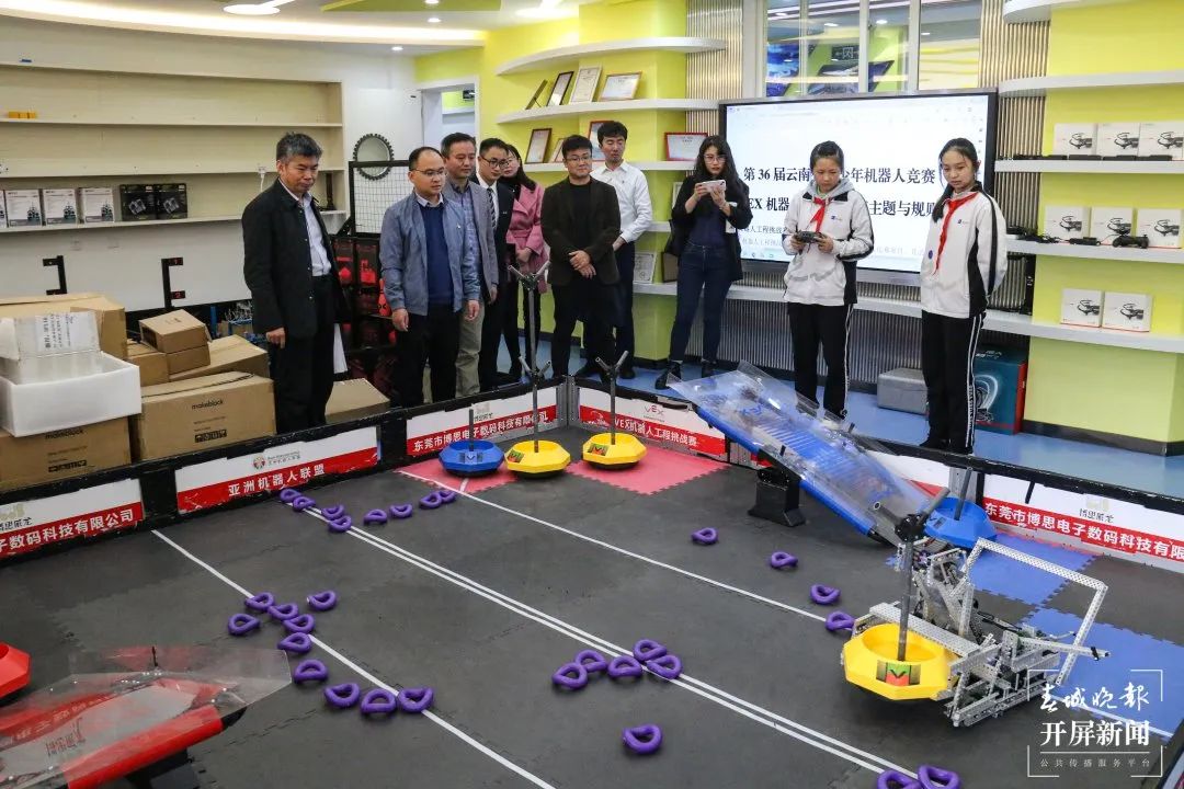 授牌仪式结束后,陆荣科同志一行来到云大附中创客空间,在附中教务处副主任、创客空间负责人张俊的陪同下观摩了学生现场实操智能机器人,并高度肯定云大附中科学创新实验活动取得的实效。